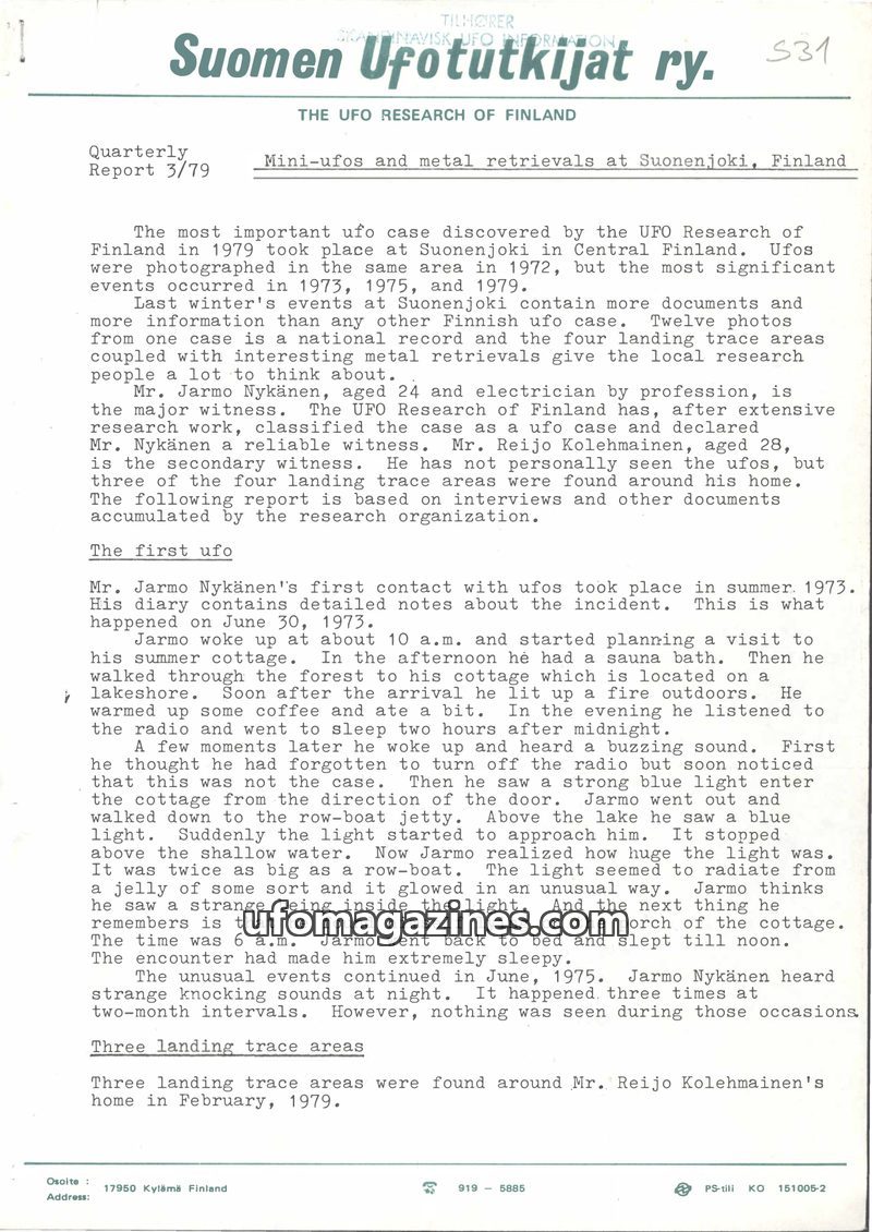 The UFO Research of Finland investigated significant UFO events in Suonenjoki, Finland, occurring in 1973, 1975, and 1979. The 1979 events involved multiple sightings of mini-ufos,