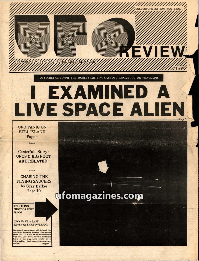 This issue of UFO REVIEW, a Collectors Edition, focuses on a startling claim by a Mexican doctor who examined a live alien, reportedly brought to UN headquarters. It explores a pot