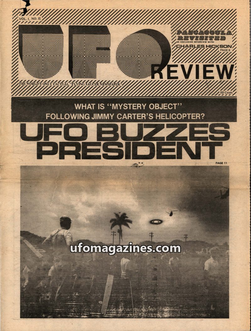 This issue of UFO Review focuses on the Pascagoula UFO abduction with an exclusive interview with Charles Hickson, who details his encounter with robotic beings. It also covers a U