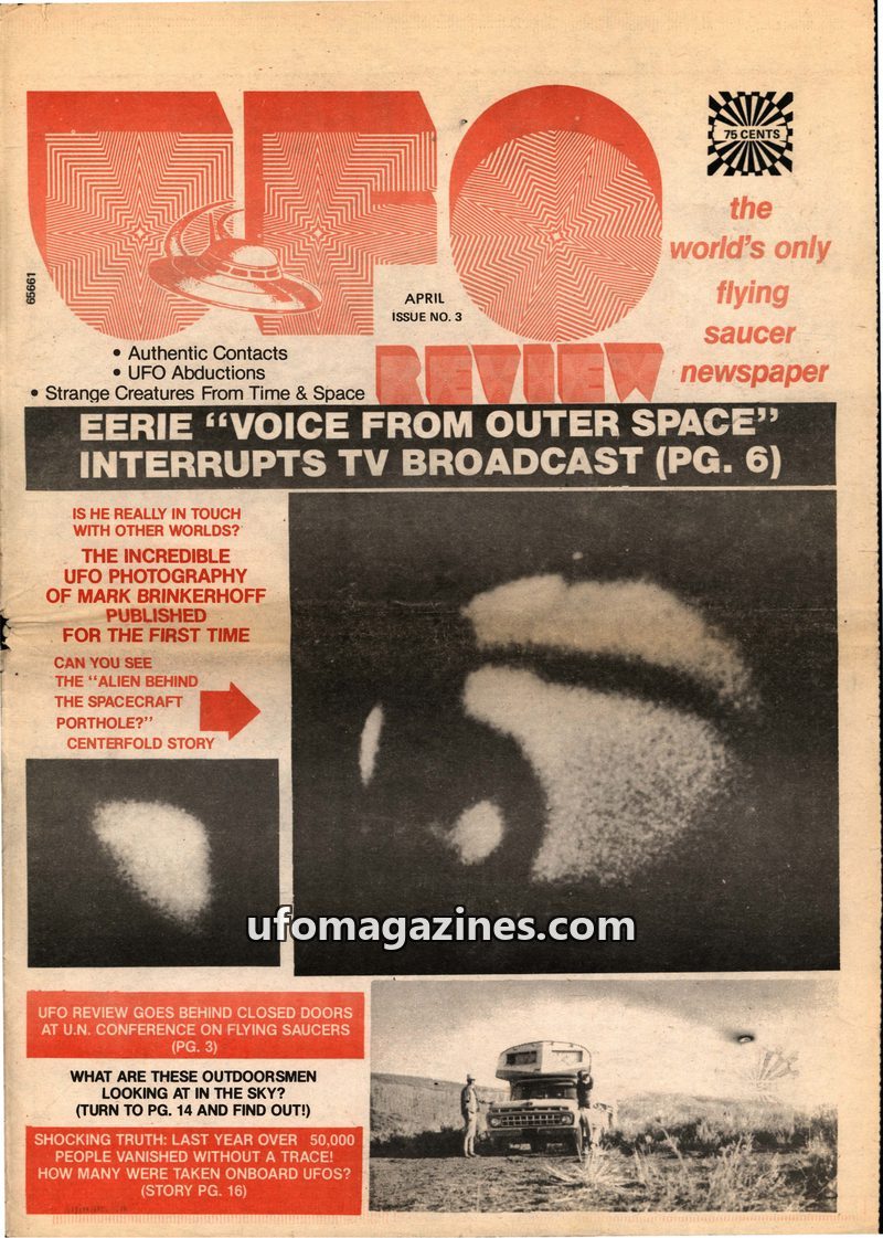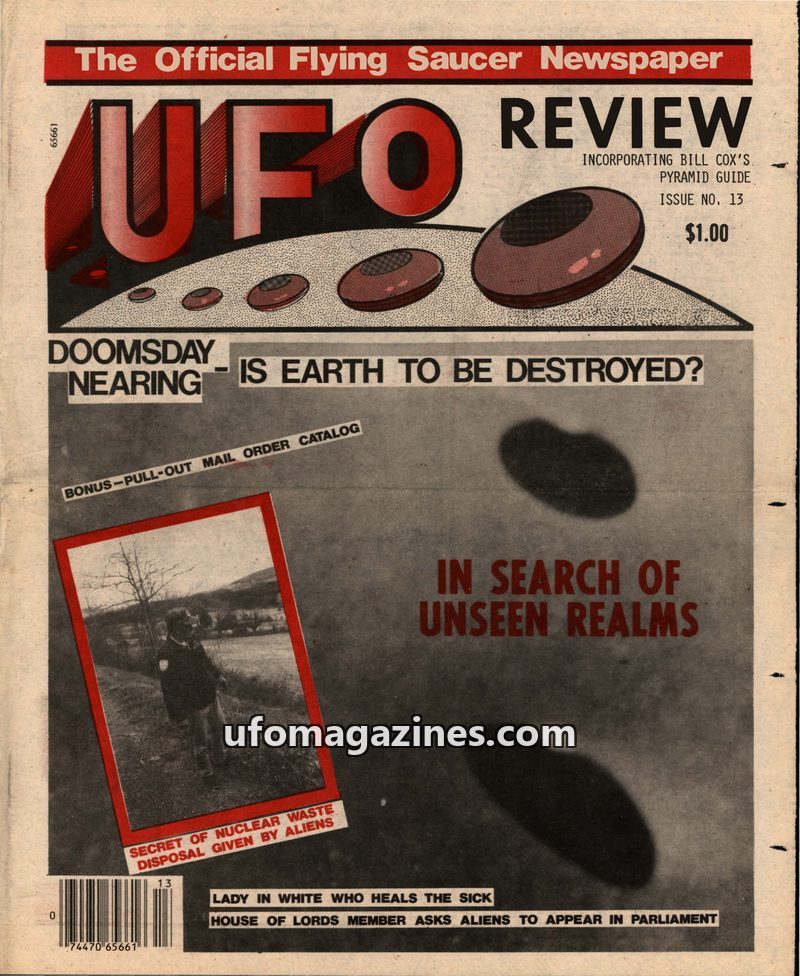 This issue of UFO REVIEW delves into mysterious radio transmissions, including a broadcast from 'Glon' of the 'Asteron Gallactic Command' warning of disaster. It features incredibl