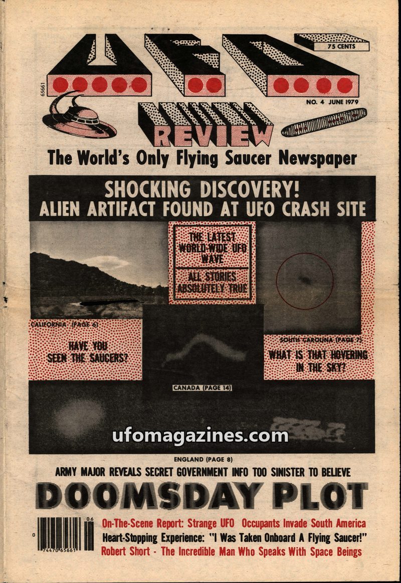This issue of UFO Review from June 1979 focuses on a claimed alien artifact found at a UFO crash site in California by John Peele. The magazine also reports on a 'Doomsday Plot' in