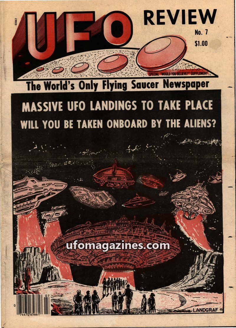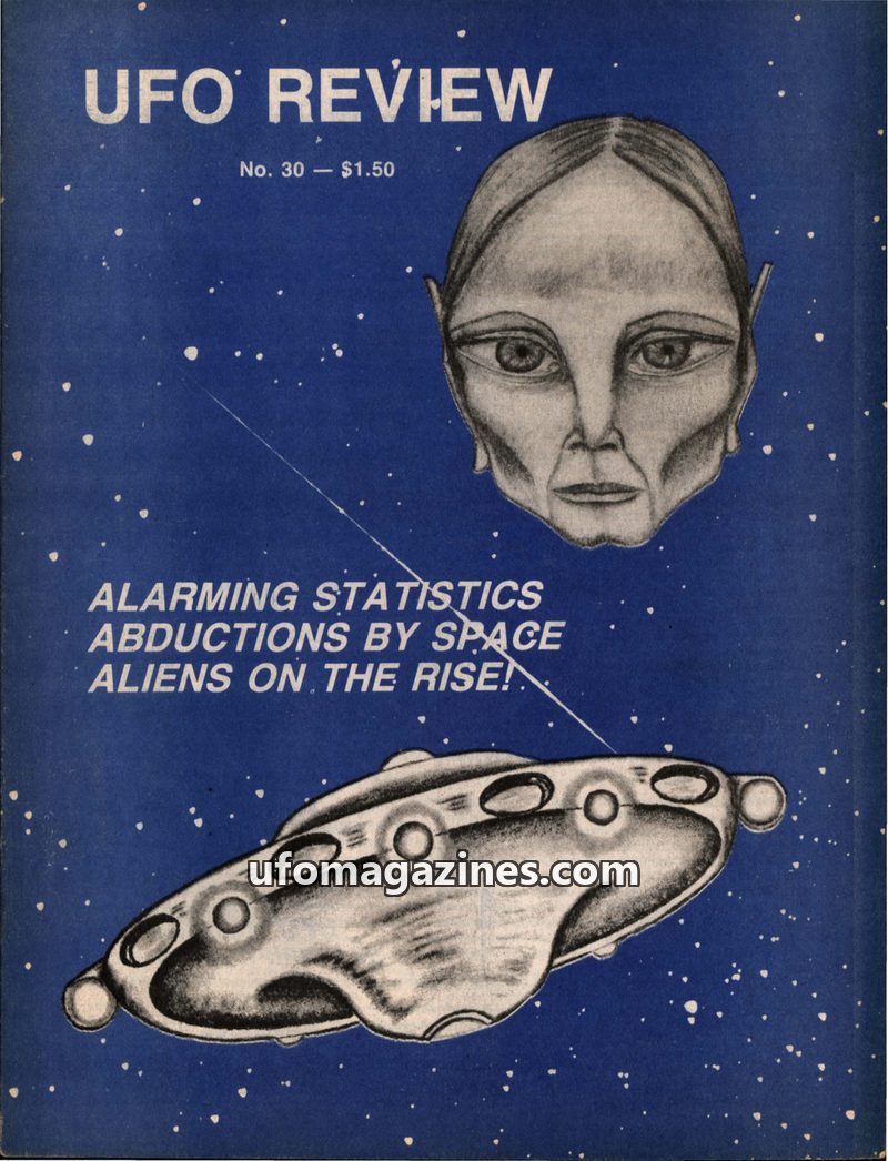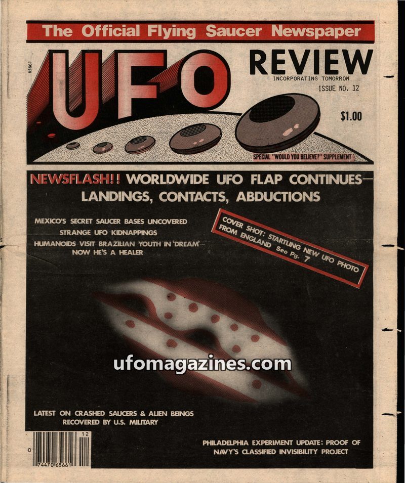 This issue of UFO Review details a global UFO flap with reports of landings, contacts, and abductions. It investigates claims of secret UFO bases in Mexico, strange alien kidnappin