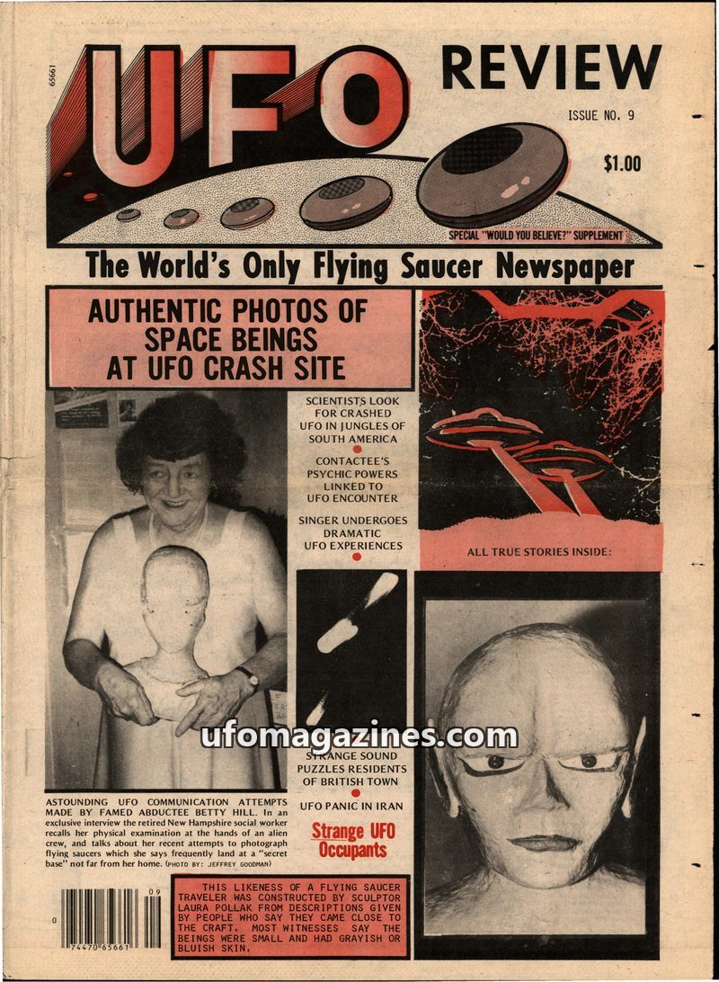 This issue of UFO Review focuses on alleged UFO crashes and alien encounters. It features an interview with Betty Hill, who discusses her abduction experiences and ongoing UFO obse