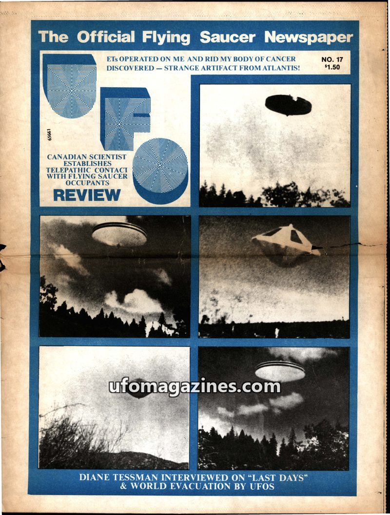 This issue of The Official Flying Saucer Newspaper features a cover story about ETs curing cancer and discovering an artifact from Atlantis. It includes personal accounts of UFO en