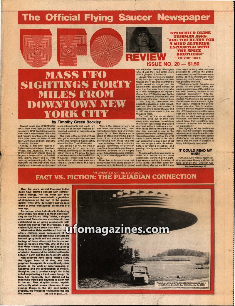 This issue of UFO REVIEW details mass UFO sightings in the New York City area, with witnesses reporting large, silent, triangular craft. It explores the controversy surrounding Edu