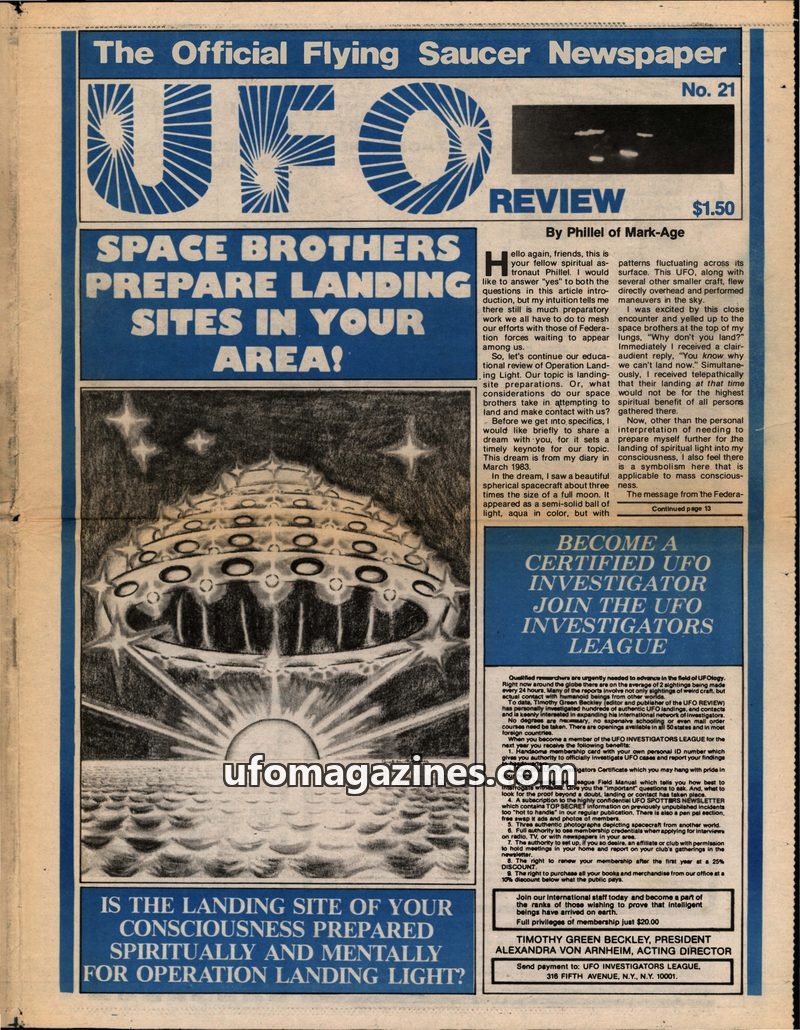 This issue of UFO REVIEW (No. 21) delves into UFO sightings and alien contact, featuring an article on 'Space Brothers' preparing for landing sites and the importance of spiritual