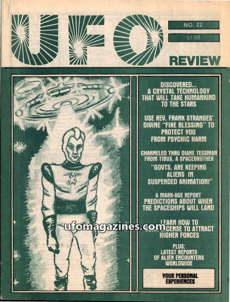 This issue of UFO REVIEW focuses on advanced technologies and spiritual concepts. It discusses a discovered crystal technology that could propel humankind to the stars and offers m