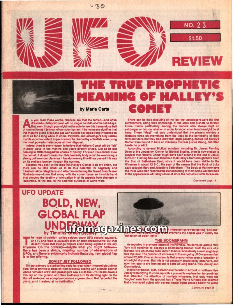 This issue of UFO REVIEW delves into the prophetic significance of Halley's Comet, suggesting its influence extends beyond astronomical observation, potentially impacting historica