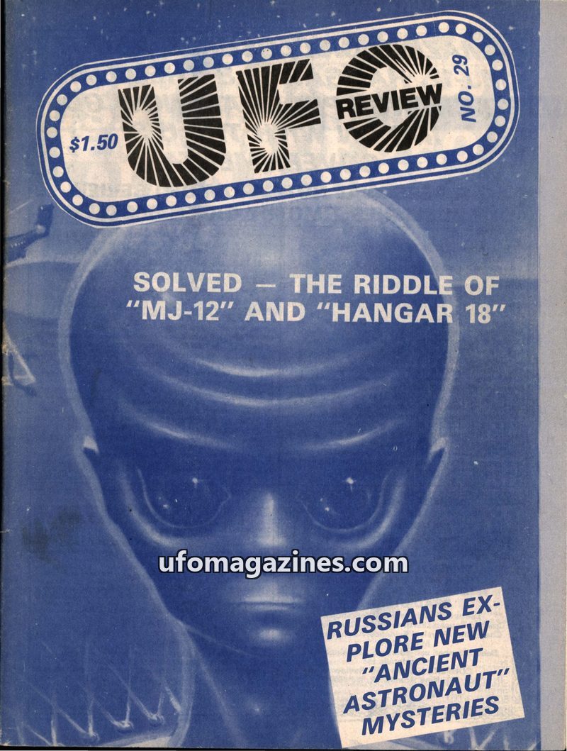 This issue of UFO Review focuses on alleged government cover-ups regarding UFOs, particularly the MJ-12 documents and the supposed storage of crashed alien craft and bodies at Hang