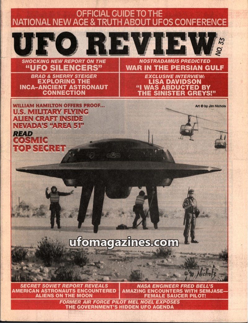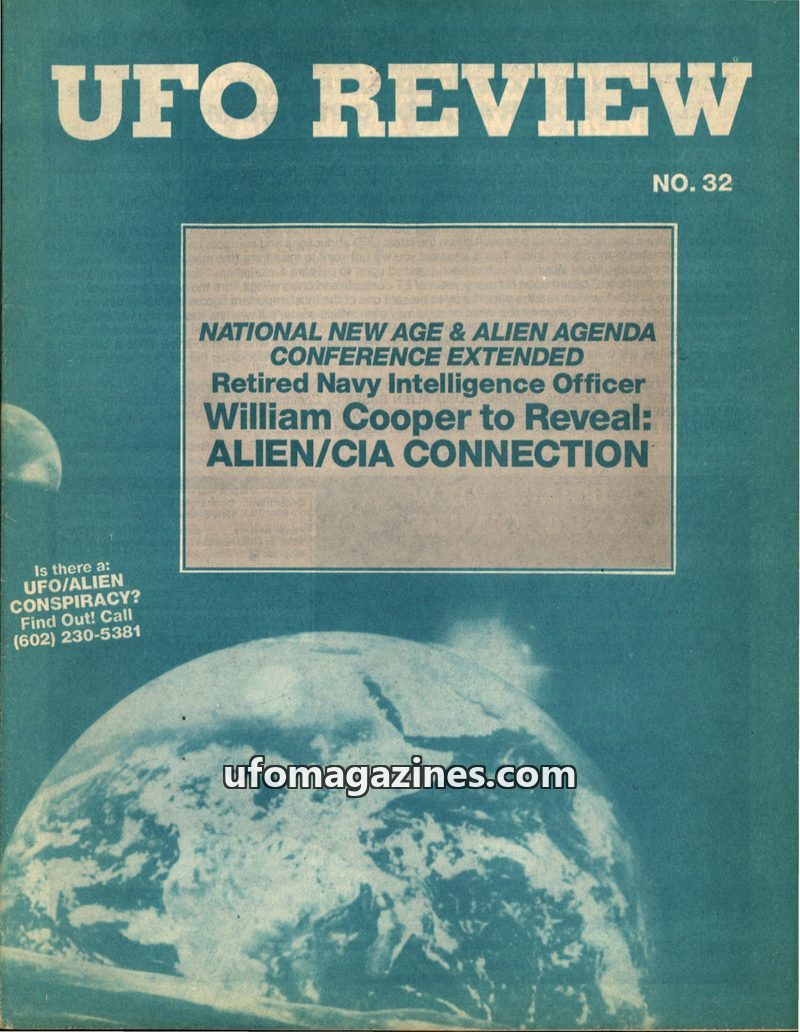 This issue of UFO REVIEW focuses on the upcoming National New Age & Alien Agenda Conference, highlighting retired Navy Intelligence Officer William Cooper's presentation on the 'Al
