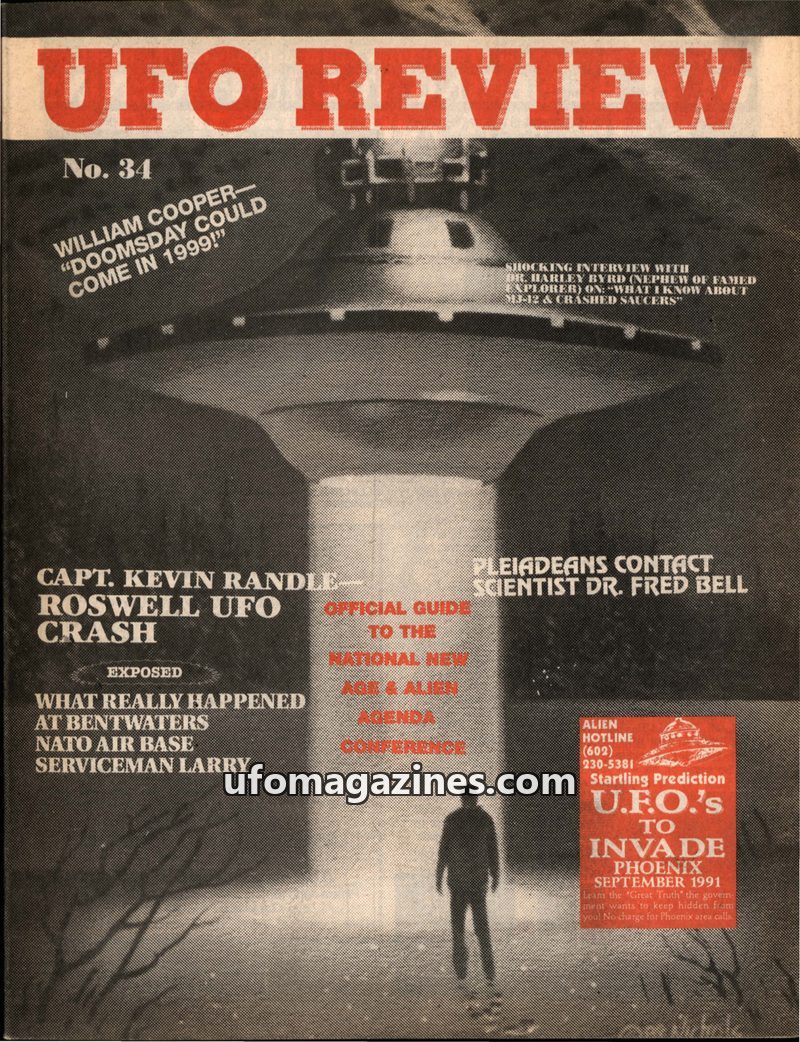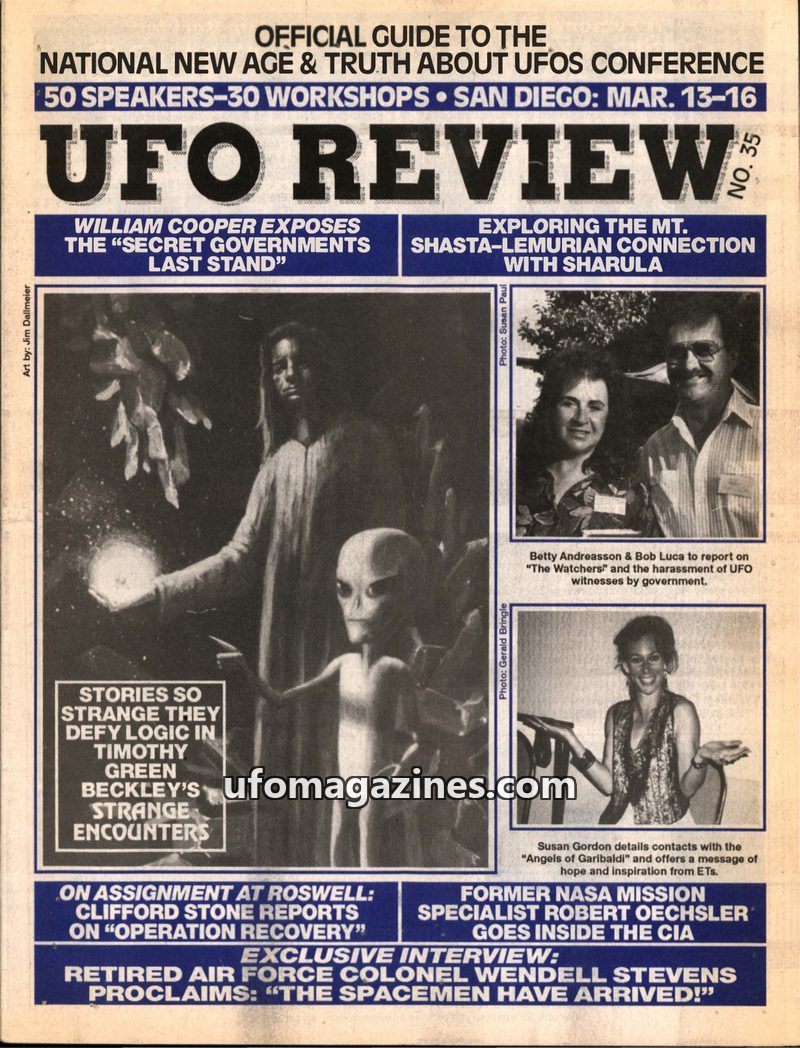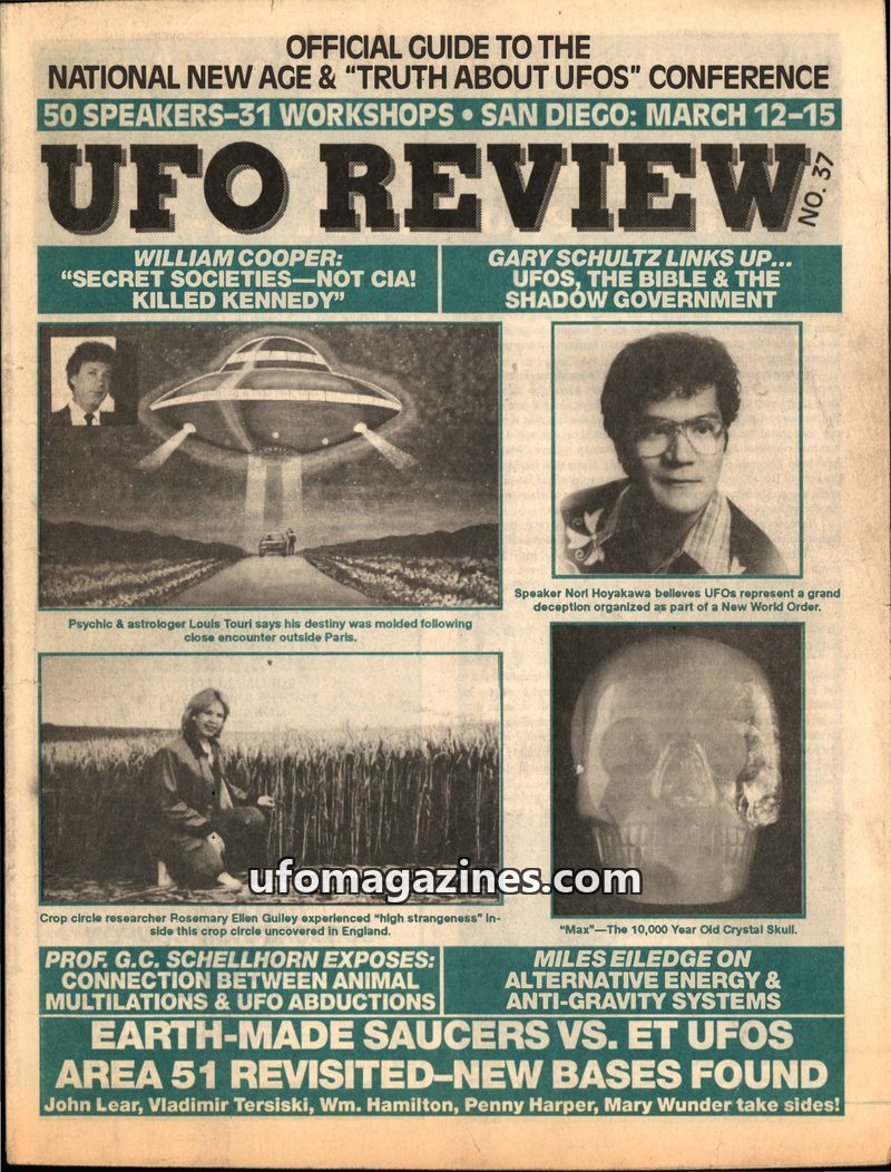 This issue of UFO REVIEW focuses on a National New Age & "Truth About UFOs" Conference in San Diego. It features articles on William Cooper's theories about secret societies and th
