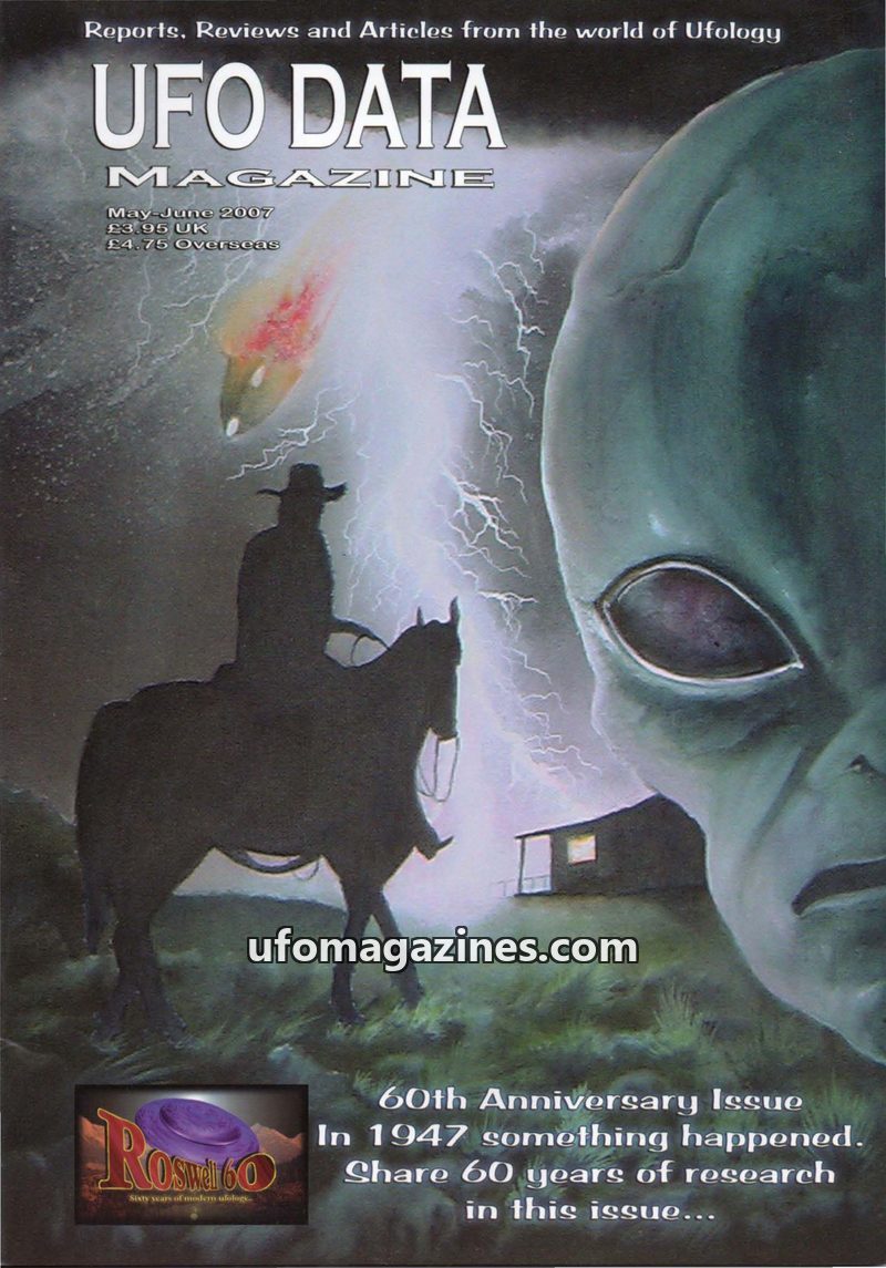 This issue of UFO DATA Magazine commemorates the 60th anniversary of the Roswell Incident and Kenneth Arnold's 'Flying Saucer' sighting. It features an in-depth investigation into