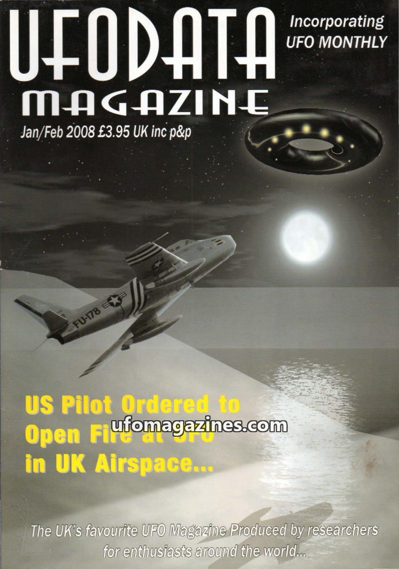 This issue of UFODATA Magazine, dated Jan/Feb 2008, prominently features a report on a 1957 incident where a USAF pilot was ordered to engage a UFO over UK airspace. The pilot, Mil
