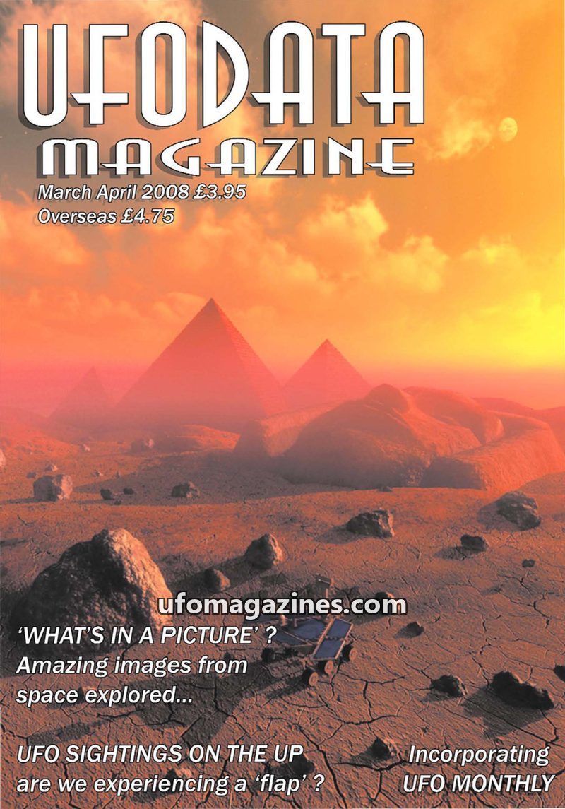 This issue of UFODATA MAGAZINE covers a surge in UFO sightings in early 2008, including the Stephenville, Texas events and a Mars Rover image interpreted as a humanoid figure. It r