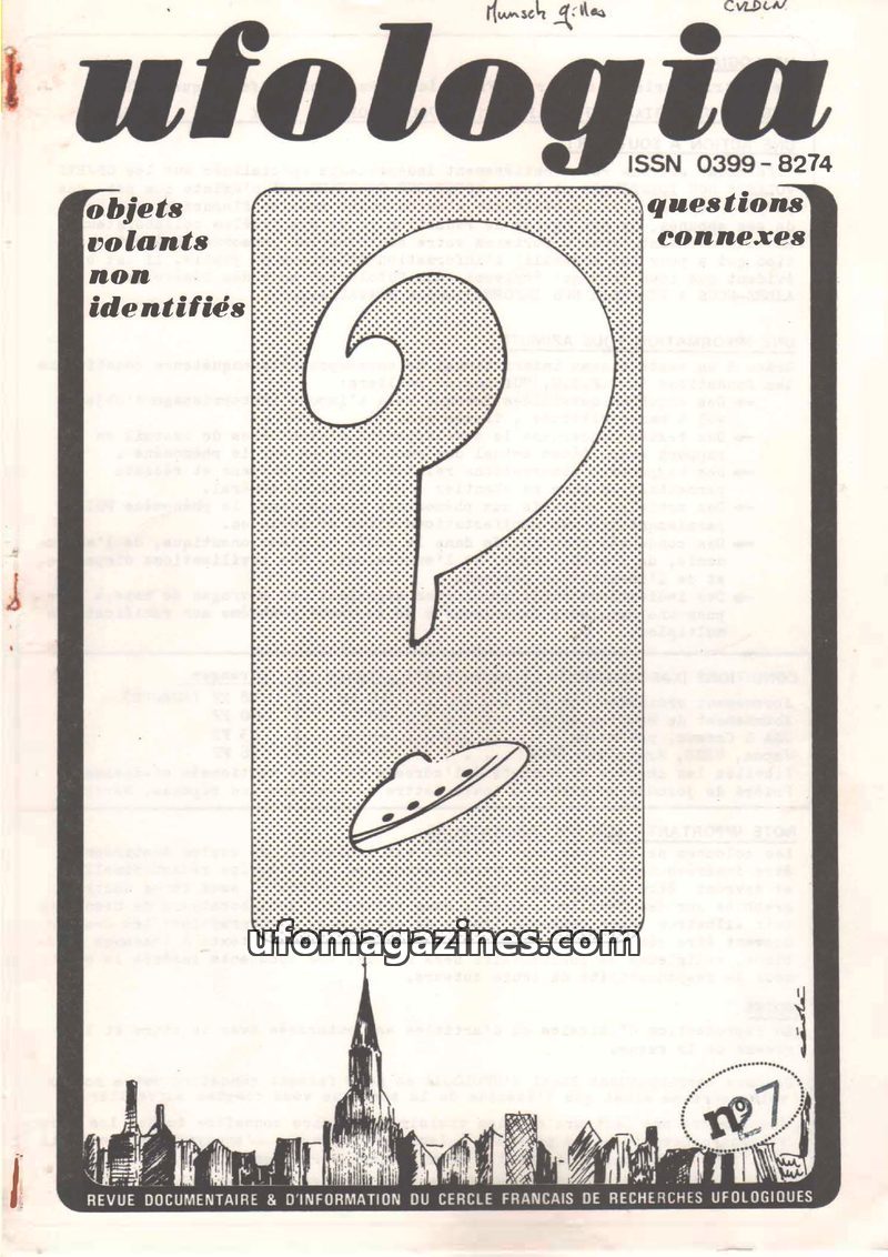 This issue of Ufologia, published by the Cercle Français de Recherches Ufologiques (CFRU), focuses on UFO sightings and related questions. It includes a detailed editorial emphasiz