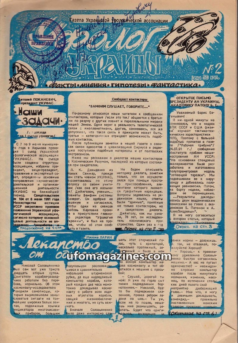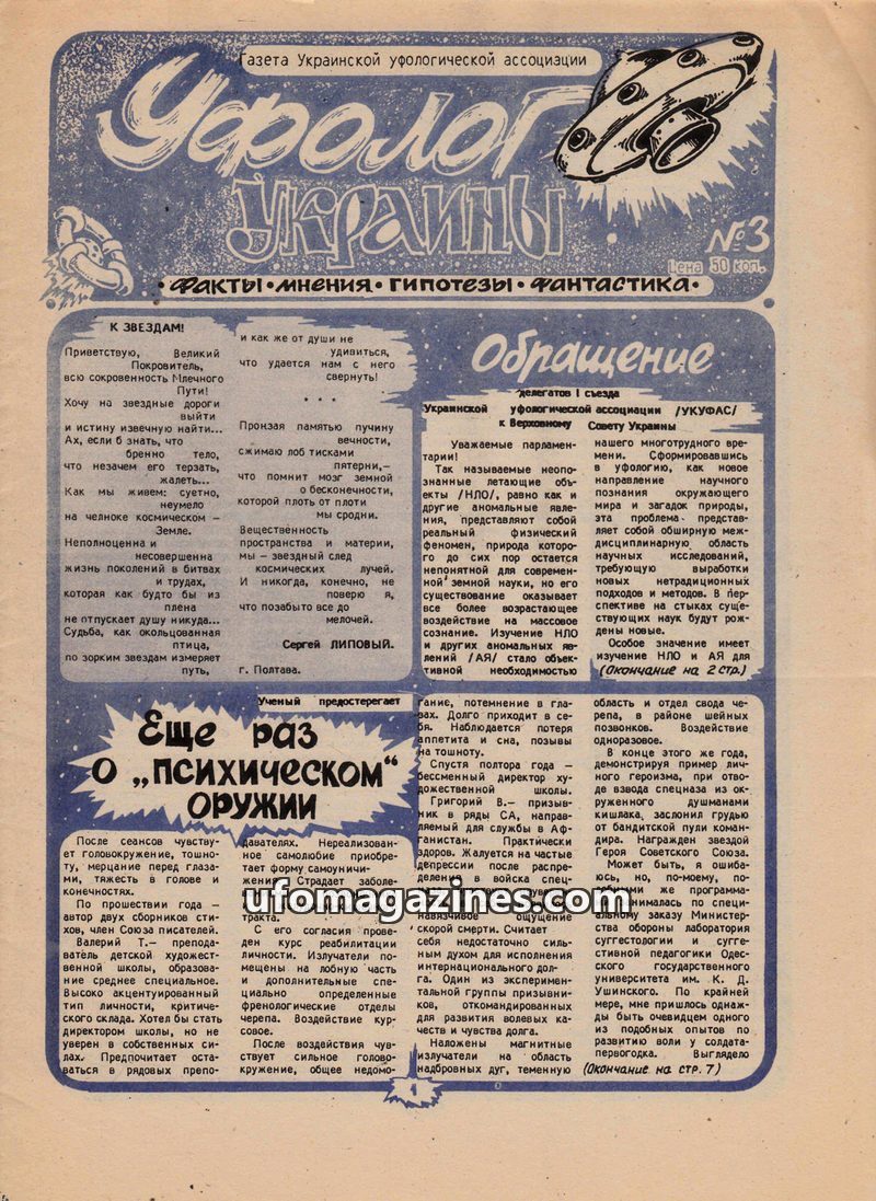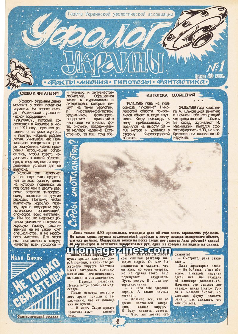 This issue of the Ukrainian Ufological Association's newspaper covers the founding of the association, contactee reports from Ukraine, and a fictional story about a cosmonaut's lon