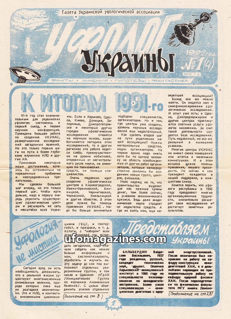 The issue reviews the progress of the Ukrainian Ufological Association (UКУФАС) in 1991, highlighting the establishment of the association and scientific conferences. It discusses