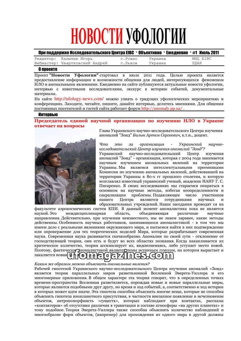 This issue of "Ufology News" from July 2011 focuses on the scientific study of anomalous phenomena, particularly UFOs. It features an interview with Artem Bilyk of the Ukrainian Sc
