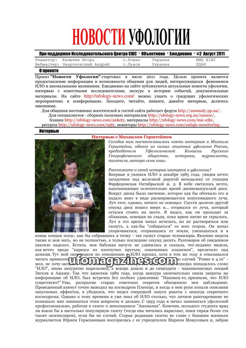 This issue of 'Ufology News' features interviews with prominent ufologists Mikhail Gershtein, Lev Shneider, Sergey Shpakovskiy, Alexey Leibman, and Edik Gozhin, covering their pers