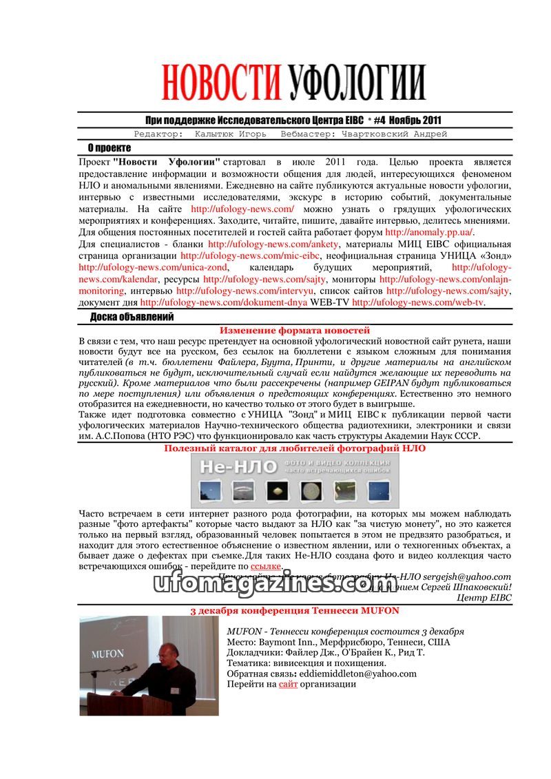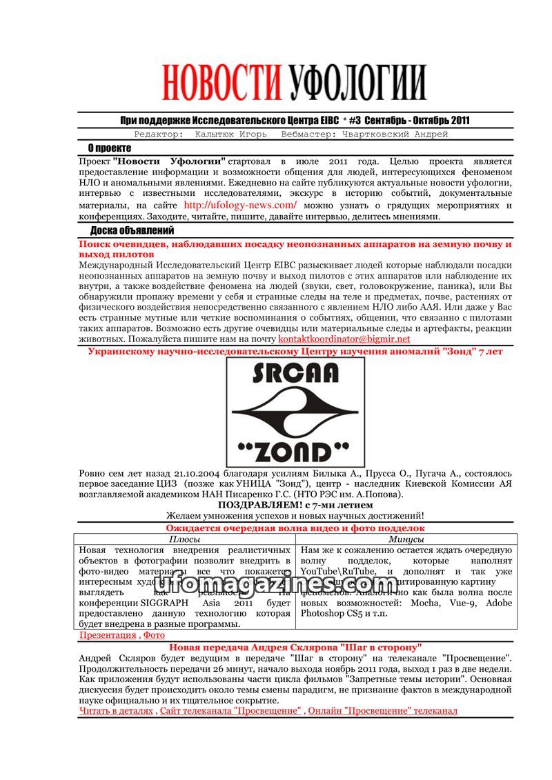 This issue of 'Novosti Ufologii' (September-October 2011) covers a range of topics including the launch of the 'Novosti Ufologii' project, the 7th anniversary of the 'Zond' researc