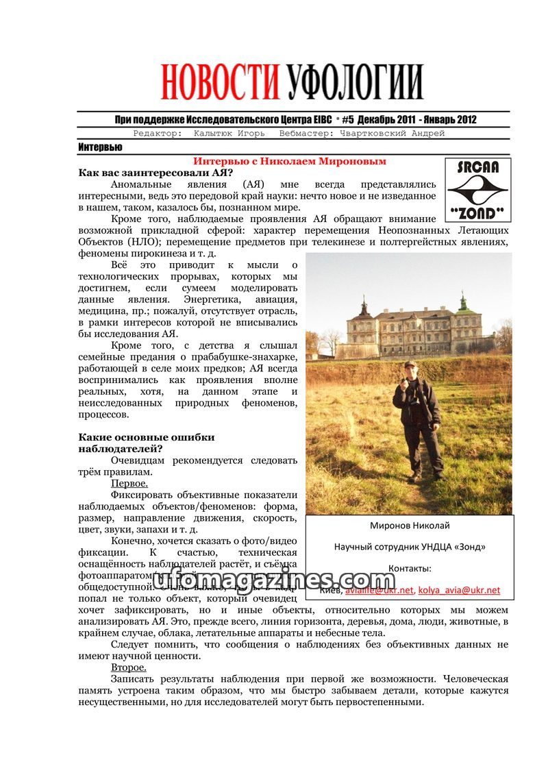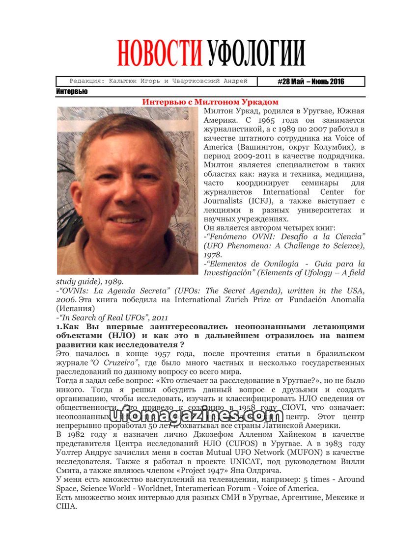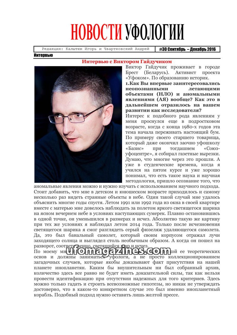This issue of Ufology News features an interview with Sergey Petrov, coordinator of the Kharkiv Operational Group for the Study of Anomalous Phenomena, who shares his personal UFO