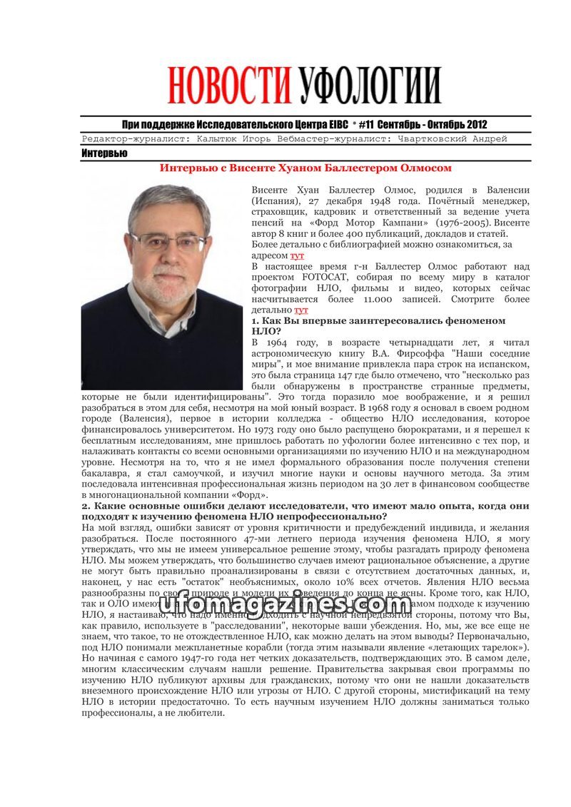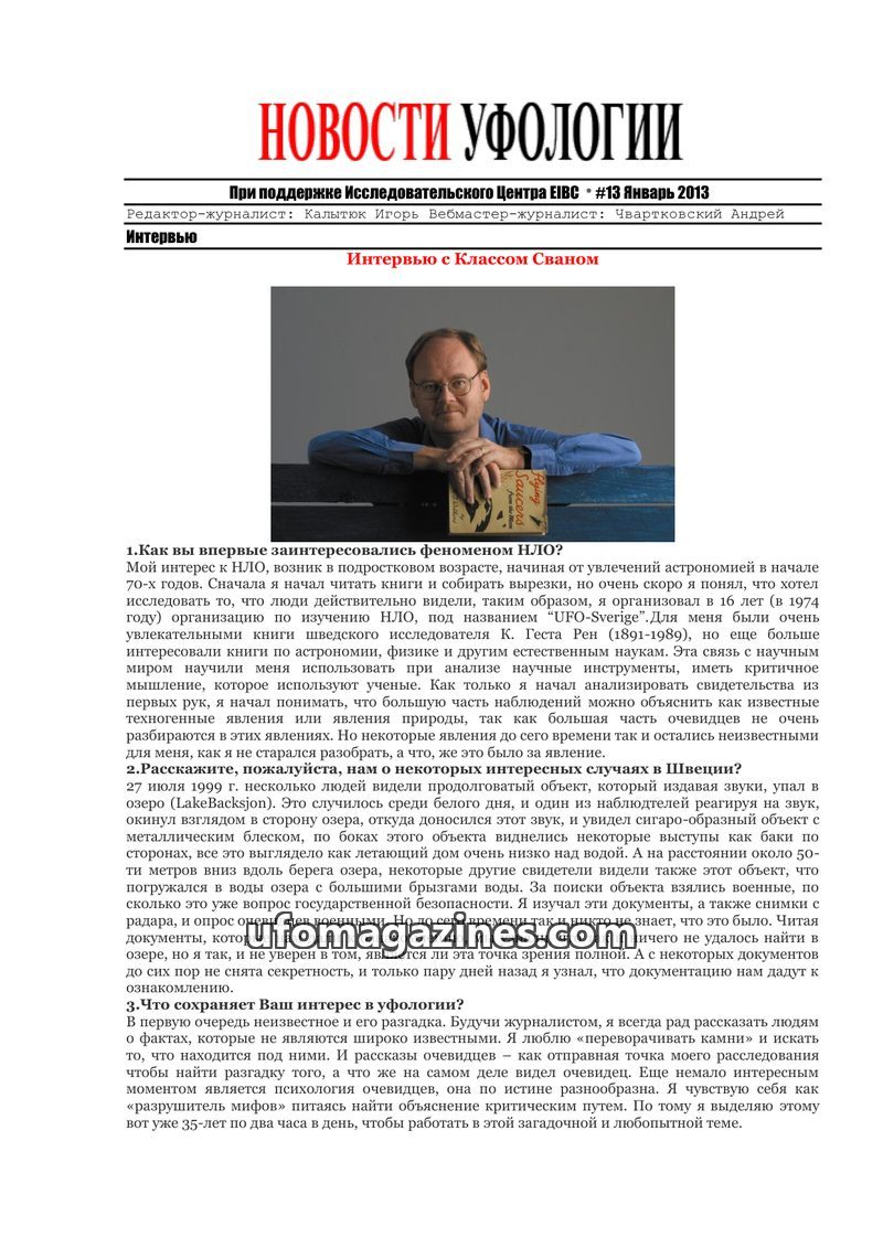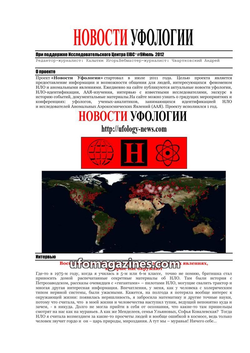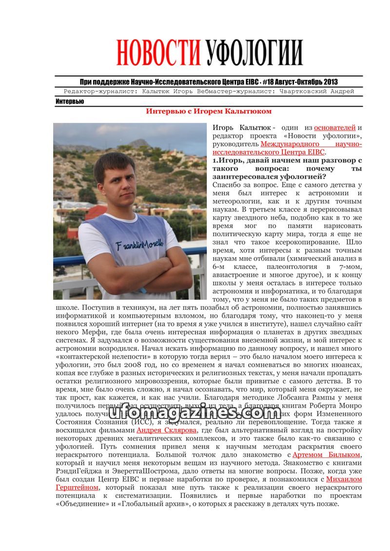This issue features an interview with Igor Kalytyuk, founder of 'Ufology News' and head of the EIBC research center. He discusses his personal journey into ufology, his research pr