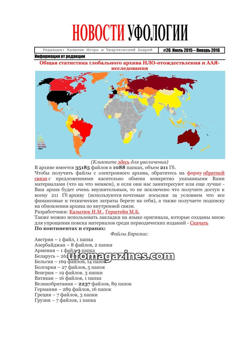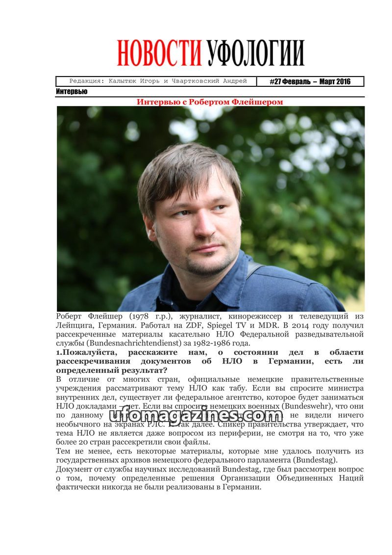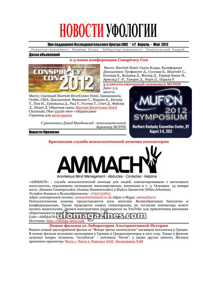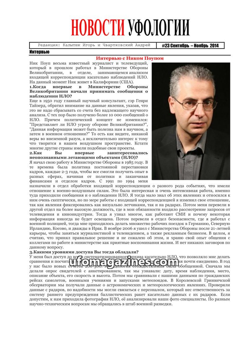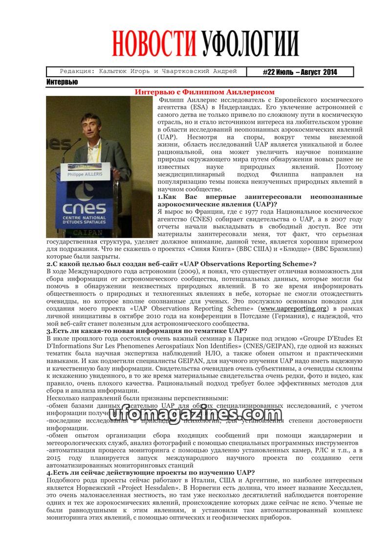 This issue features an interview with Igor Kalytyuk, founder of 'Ufology News' and head of the EIBC research center. He discusses his personal journey into ufology, his research pr