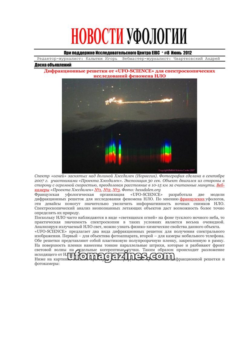 This issue of 'Ufology News' focuses on the development of diffraction gratings by UFO-SCIENCE for analyzing UFO phenomena, offering detailed spectral analysis. It also covers vari