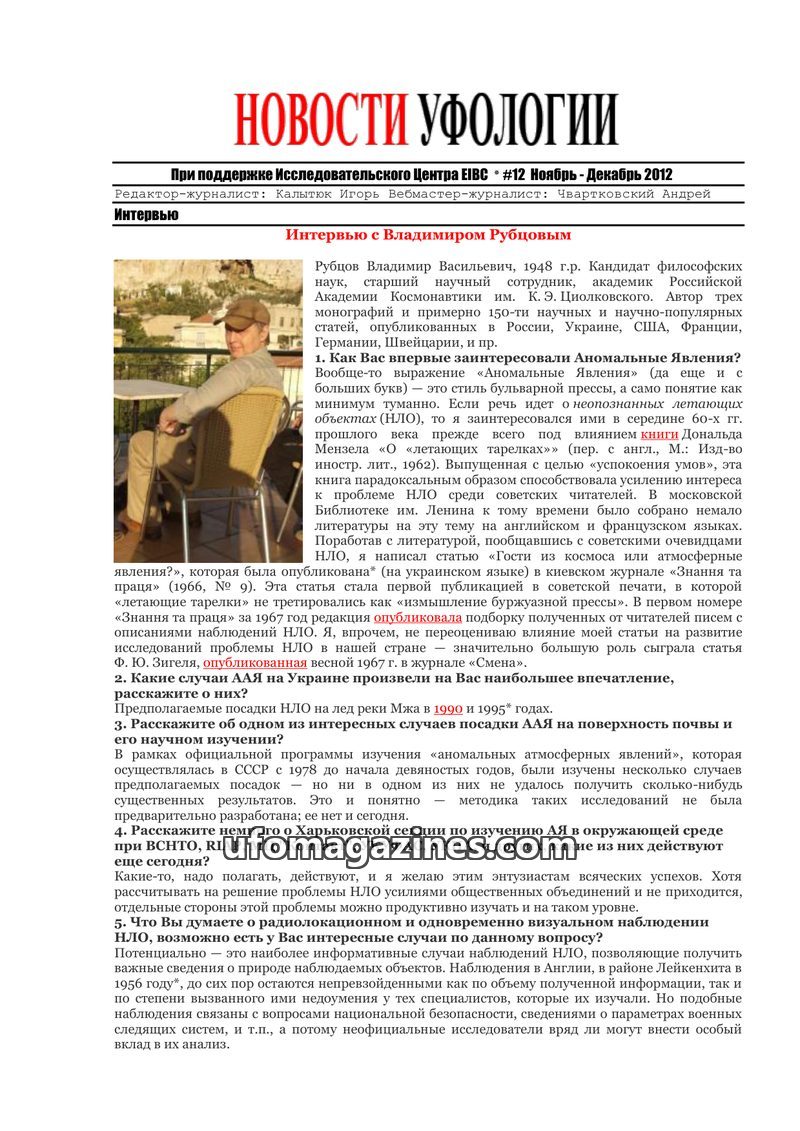 This issue of 'Ufology News' features an in-depth interview with Vladimir Rubtsov, discussing his interest in anomalous phenomena and the state of UFO research in Russia. It also r