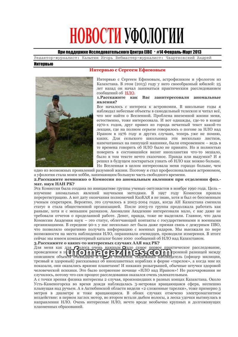 This issue of Ufology News features an interview with Sergey Efimov, an astrophysicist and ufologist from Kazakhstan, who discusses his 25-year career investigating UFOs and the wo