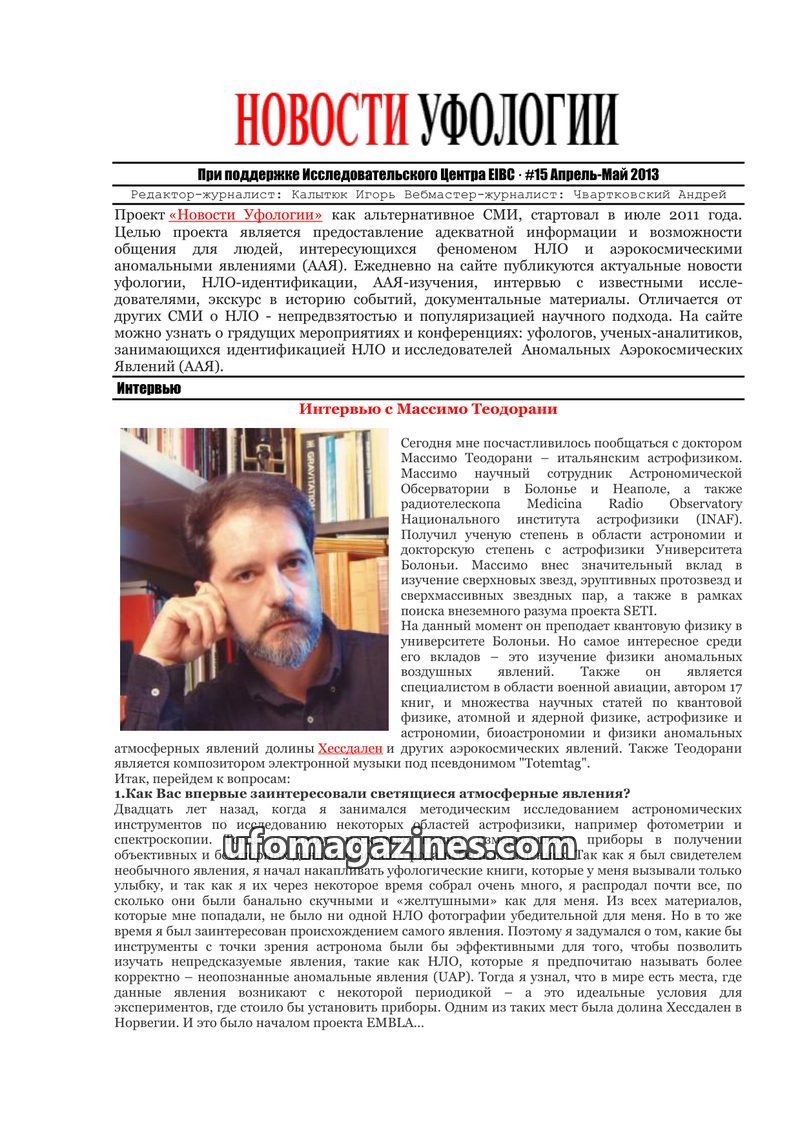 This issue of 'Novosti Ufologii' features an extensive interview with astrophysicist Massimo Teodorani, discussing his research into anomalous atmospheric phenomena, particularly t