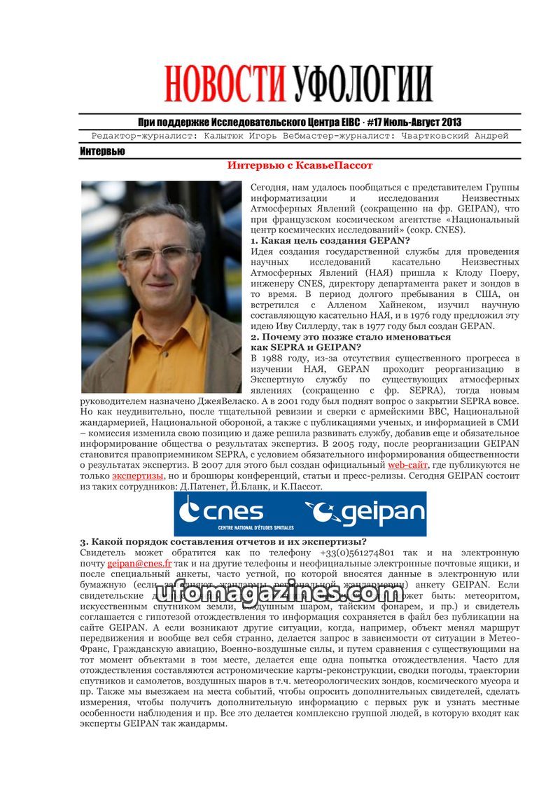 This issue of 'Ufology News' features an interview with Xavier Passot from GEIPAN, the French agency investigating Unidentified Aerial Phenomena (UAP). Passot details GEIPAN's hist