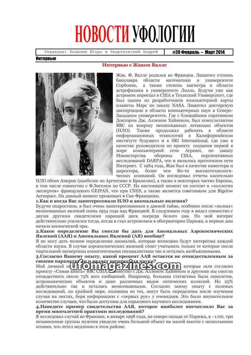 This issue of 'НОВОСТИ УФОЛОГИИ' features an interview with Jacques Vallee, who discusses his lifelong interest in UFOs and anomalous phenomena, emphasizing the need for rigorous s