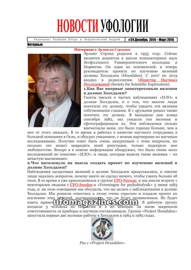 This issue of 'Ufology News' features an in-depth interview with Erling Strand about the Hessdalen phenomenon and the 'Project Hessdalen' initiative. It also highlights the release