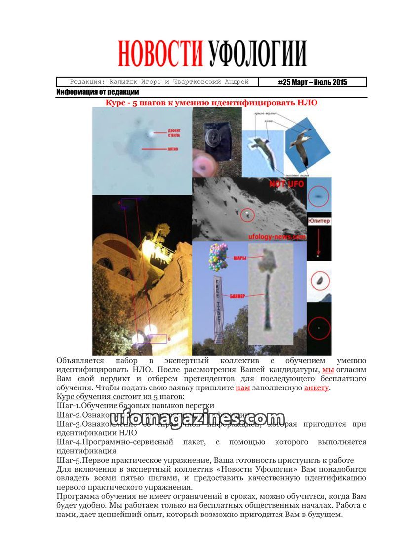 This issue of 'Novosti Ufologii' (Ufology News) from March-July 2015 focuses on training individuals to identify UFOs through a 5-step course. It highlights the project's goal of p