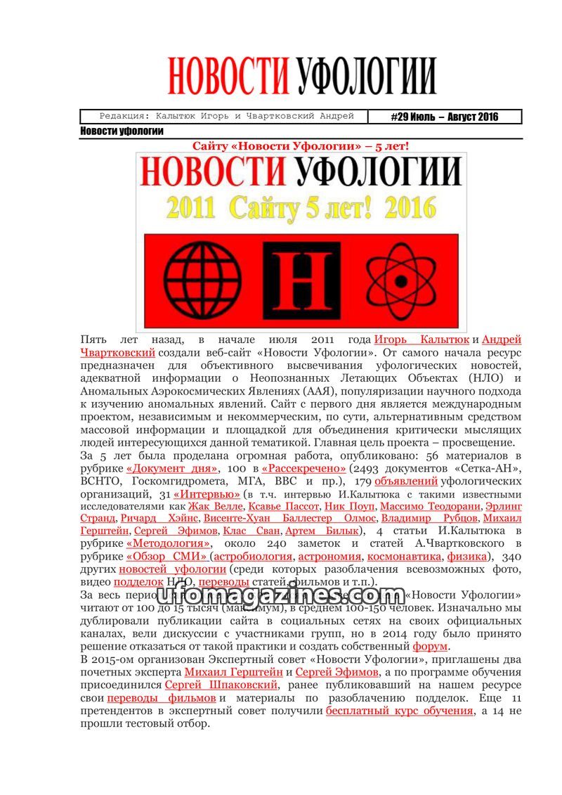 This issue of 'Novosti Ufologii' marks the 5th anniversary of the website, highlighting its extensive publication history and international reach. It includes analyses of UFO cases