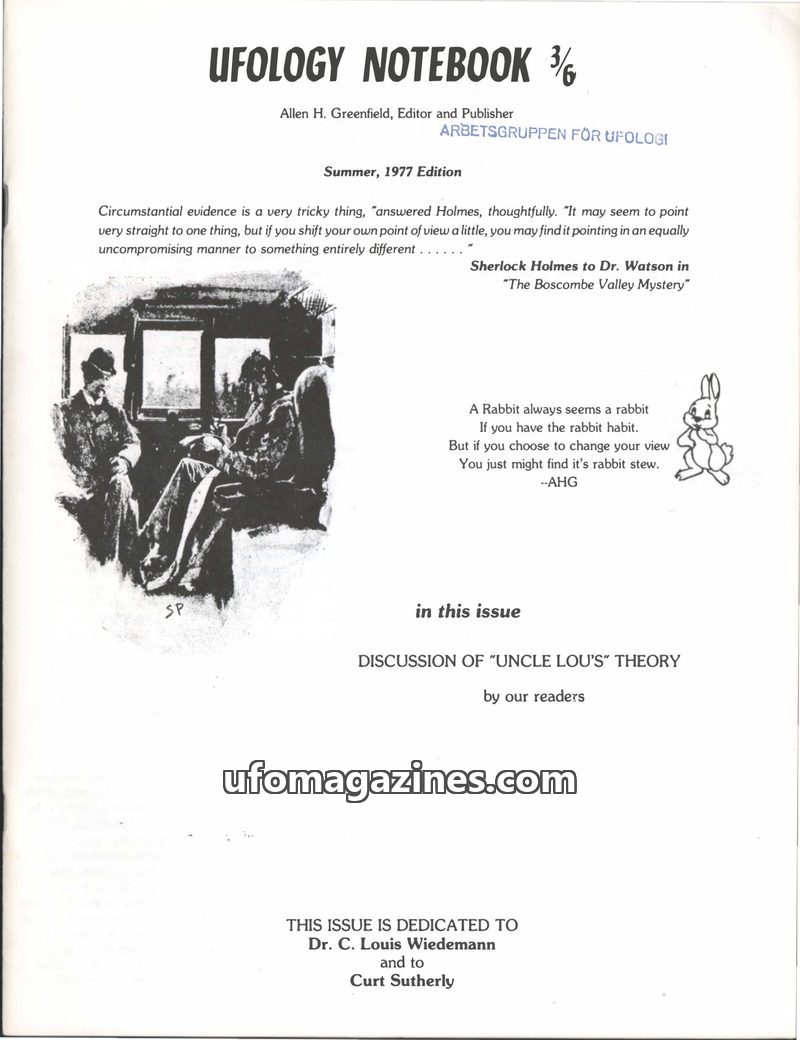 AI-generated English summaries and cover images of Ufology Notebook (Allen Greenfield) from the Archives for the Unexplained (AFU) in Norrköping, Sweden. Each entry summarises the complete contents of an issue — articles, sighting reports, interviews, key people, locations, and dates.