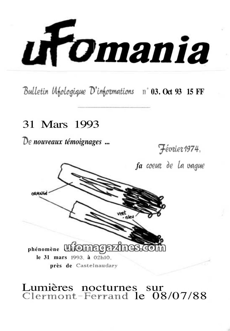 This issue of Ufomania focuses on recent UFO sightings from 1993, including a detailed account from Castelnaudary involving police witnesses and a case near Cahors. It also revisit