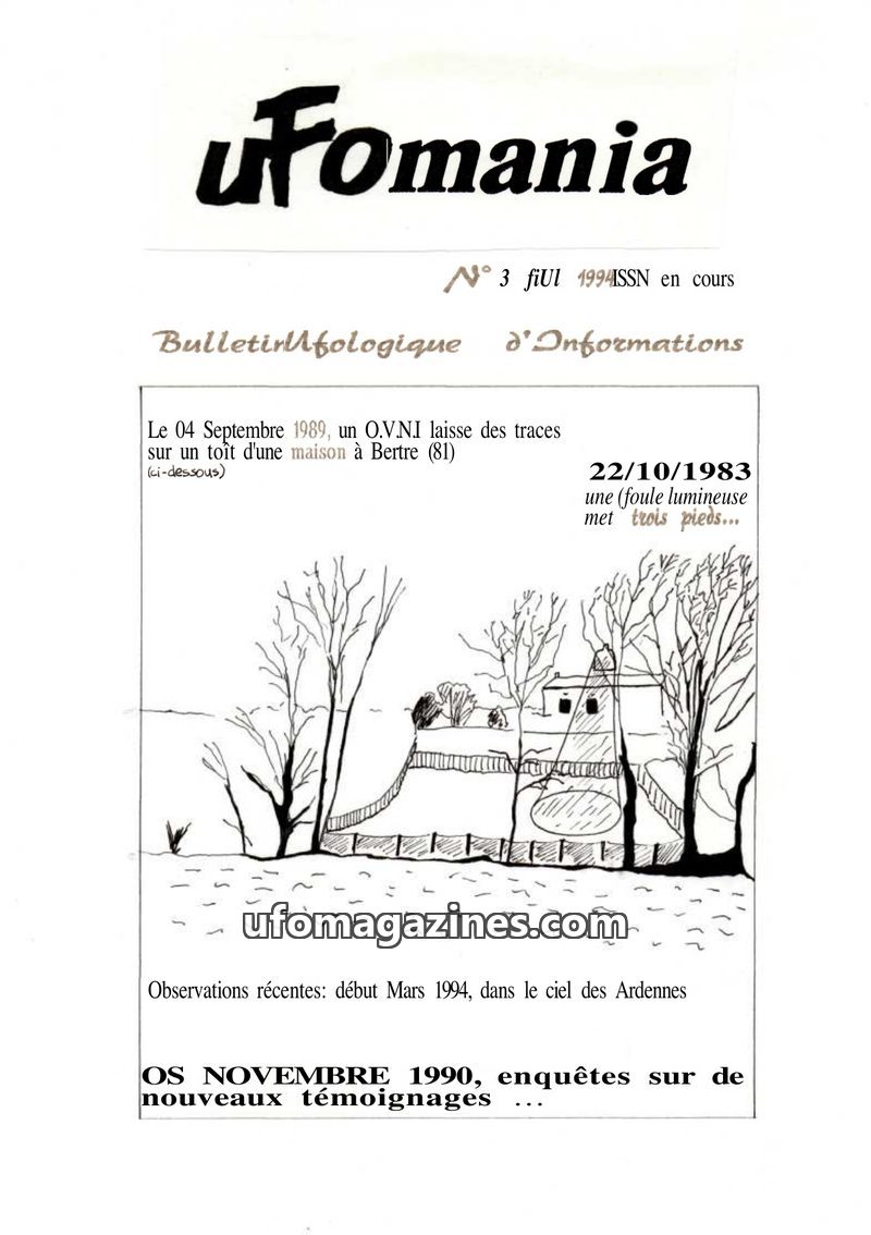 This issue of Ufomania focuses on recent UFO sightings and investigations in France. It details a case from Bertre in 1989 where a luminous object left scorched tiles on a roof, le