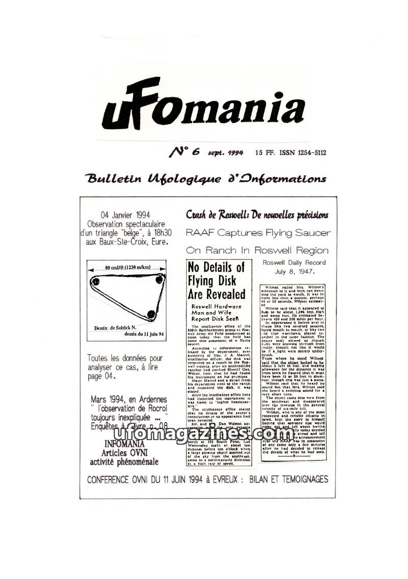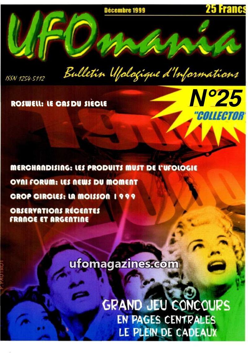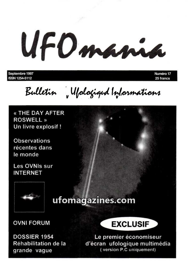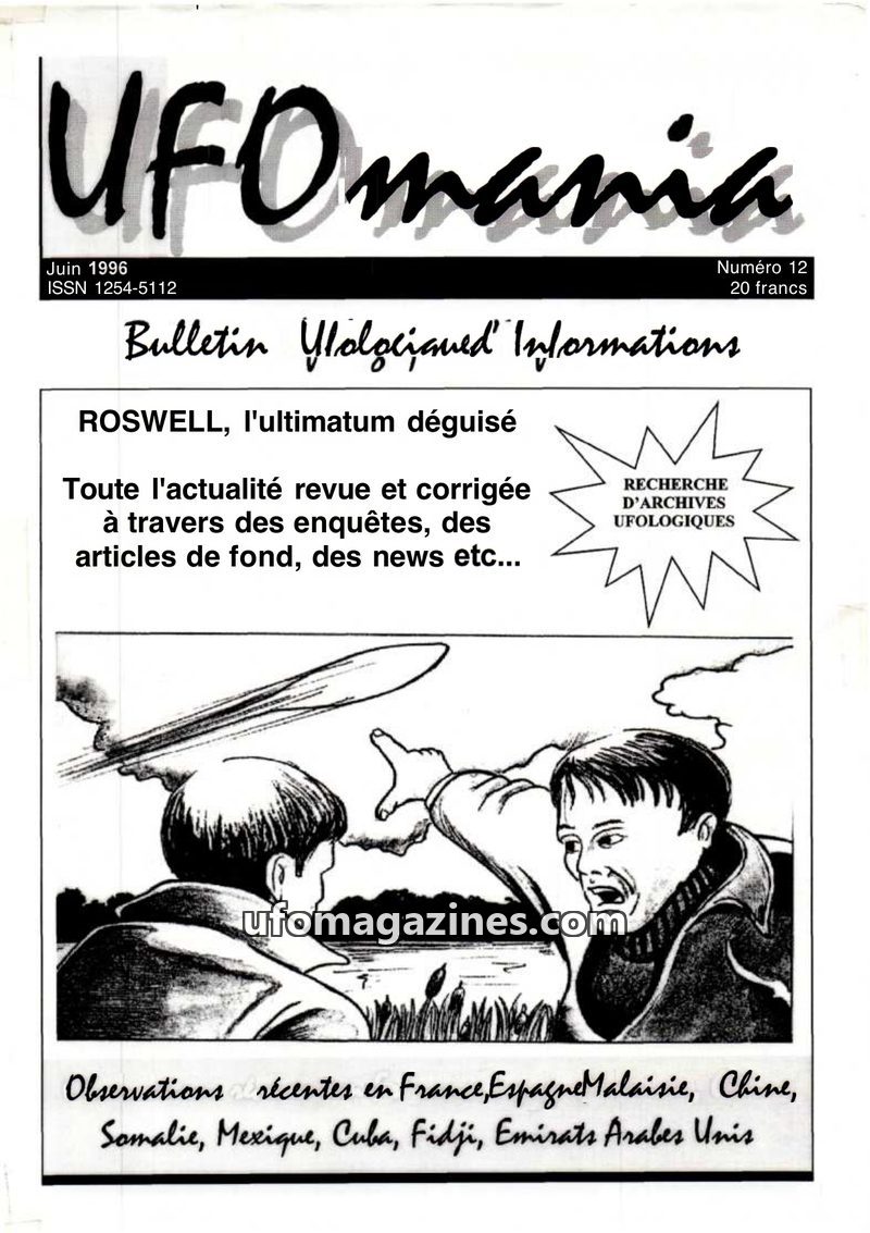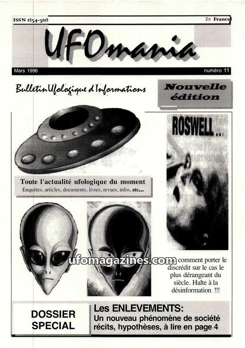 This issue of Ufomania focuses on recent UFO activity and investigations. It provides new details on the Roswell crash, including the recovery of a flying saucer and humanoids by t