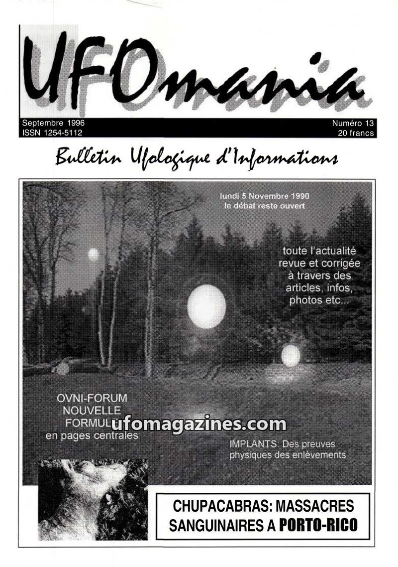 This first issue of UFOMANIA, a bulletin of ufological information, covers serious research into the UFO phenomenon from November 1992 to April 1993. It includes detailed accounts