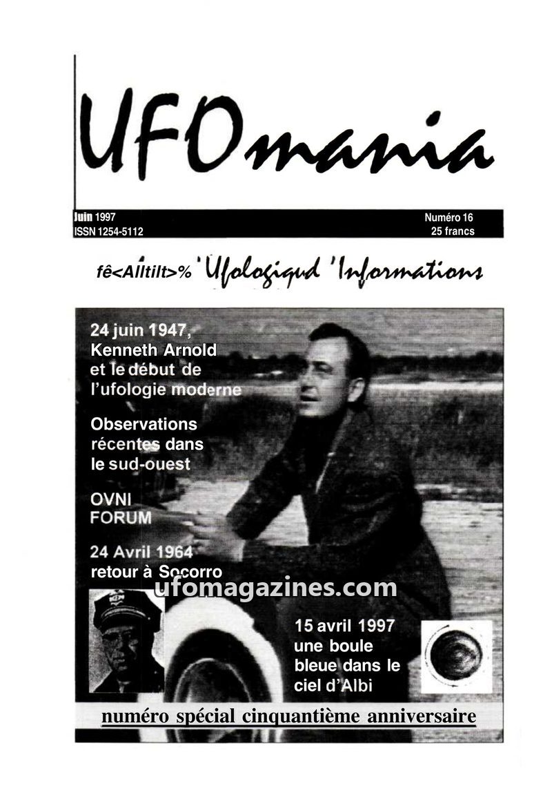 This issue of UFOmania commemorates the 50th anniversary of the Kenneth Arnold sighting and the Roswell crash, pivotal events in ufology. It explores the historical context of thes