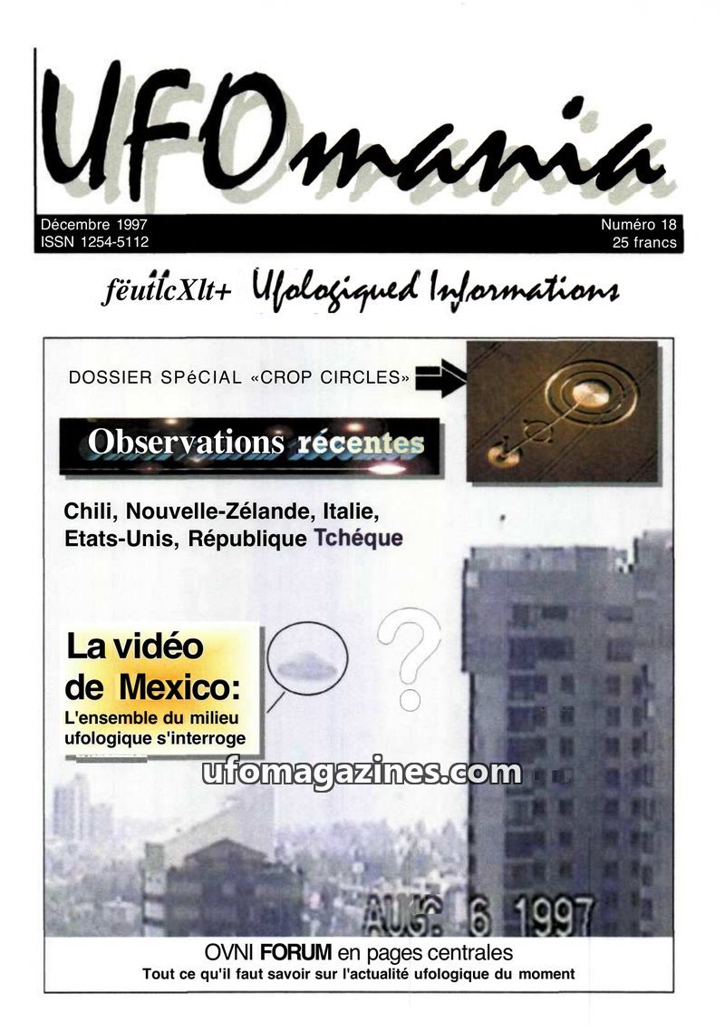 This issue of UFOmania from December 1997 focuses on recent UFO activity worldwide. It features a special report on crop circles and an in-depth look at the controversial video of