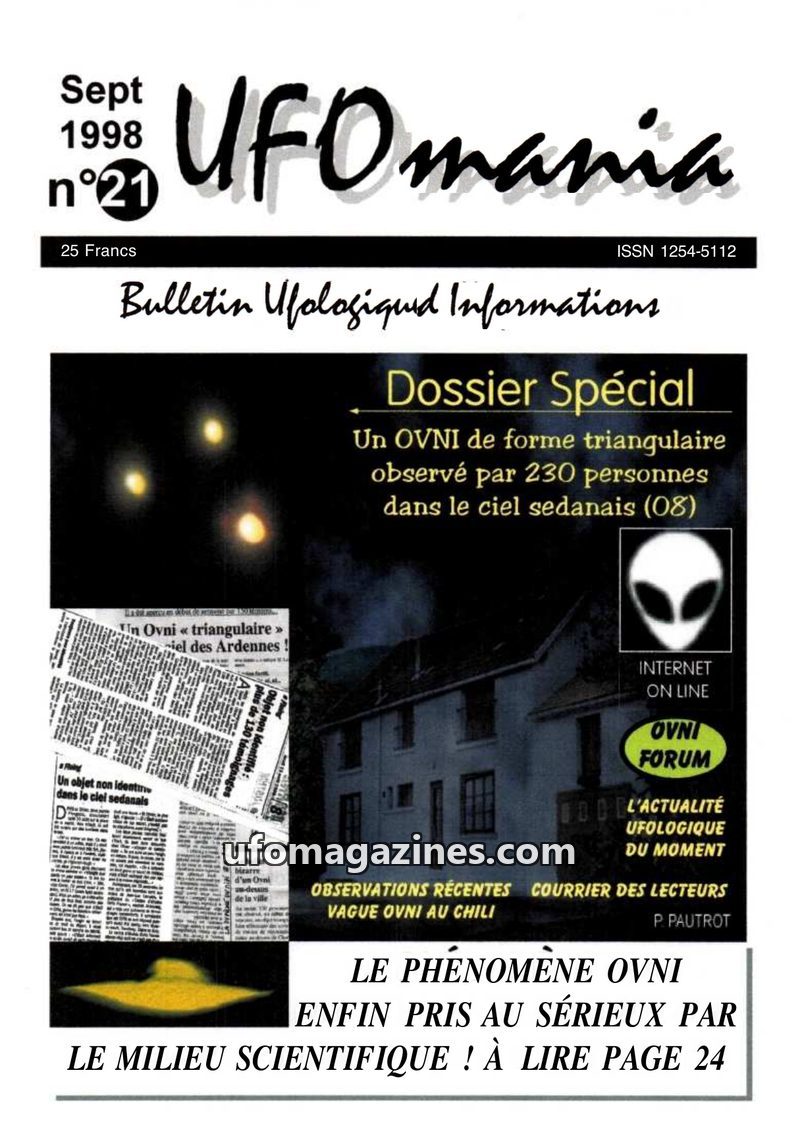 This issue of UFOmania focuses on a significant triangular UFO sighting in the Sedan region of France on August 10, 1998, witnessed by 230 people and captured on video. The magazin