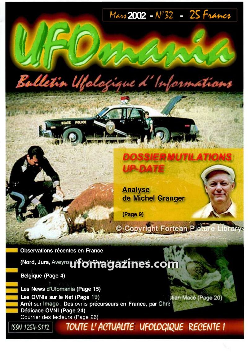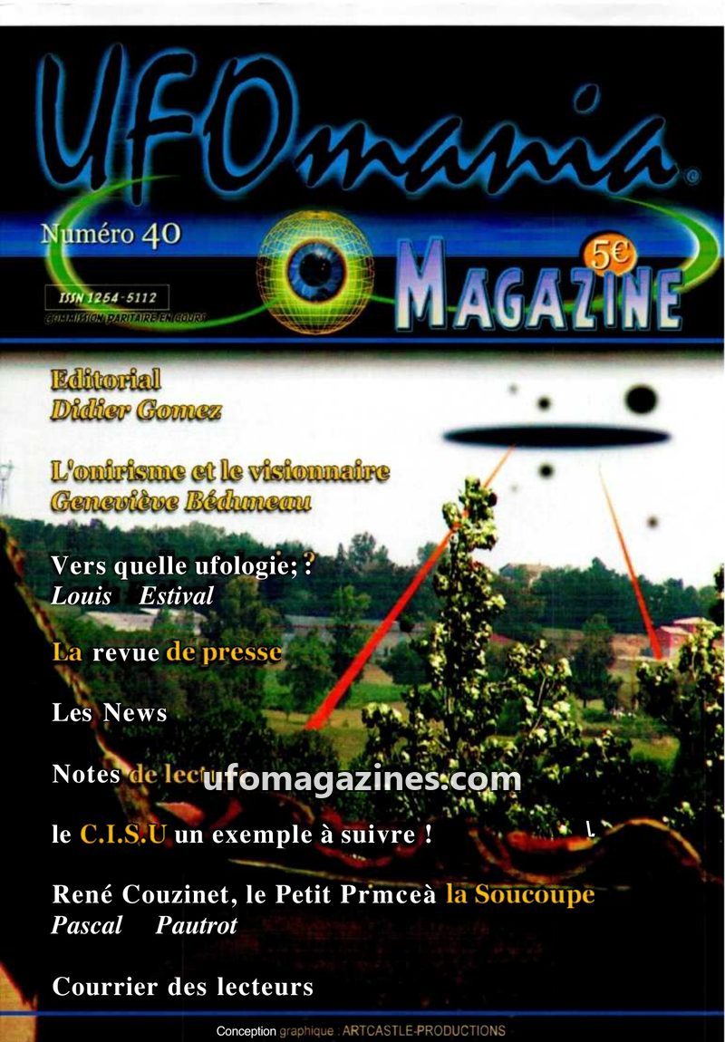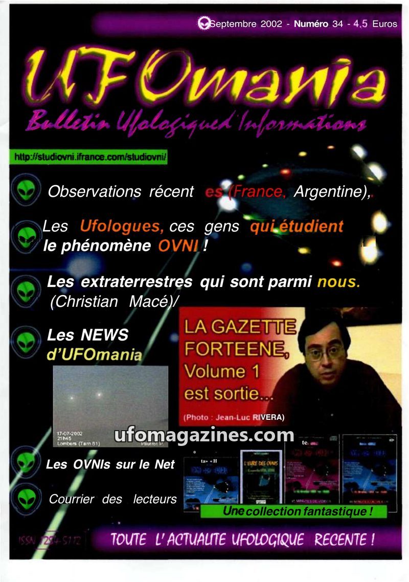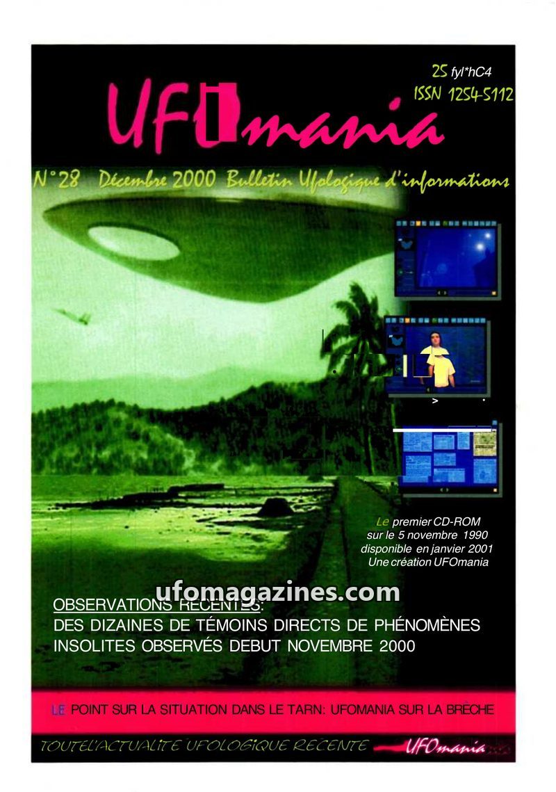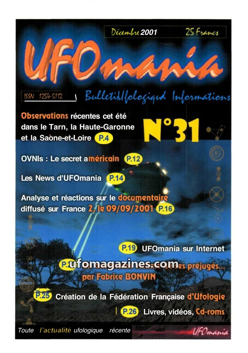 This issue of UFOmania (n°31, December 2001) focuses heavily on recent UFO sightings reported in the Tarn region, with over fifty witnesses coming forward after a press appeal. The