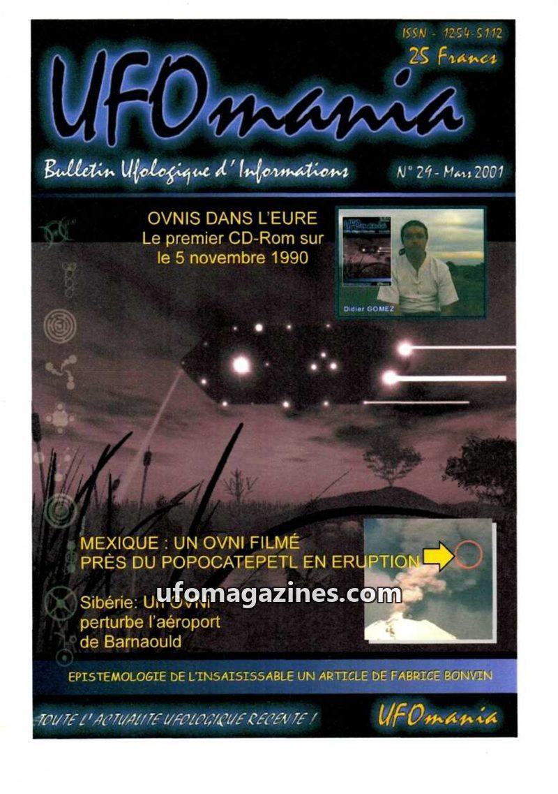 This issue of UFOmania (March 2001) covers recent UFO sightings, including a luminous object over the erupting Popocatepetl volcano in Mexico, and an incident at Barnaoul airport i