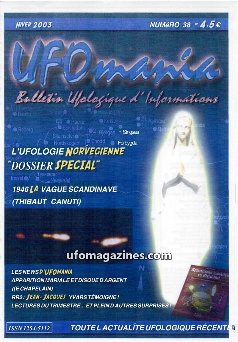 This issue of UFOmania, dated Winter 2003, focuses on Norwegian ufology with a special dossier. It details the 1946 Scandinavian UFO wave, including sightings of 'Ghost Rockets' an