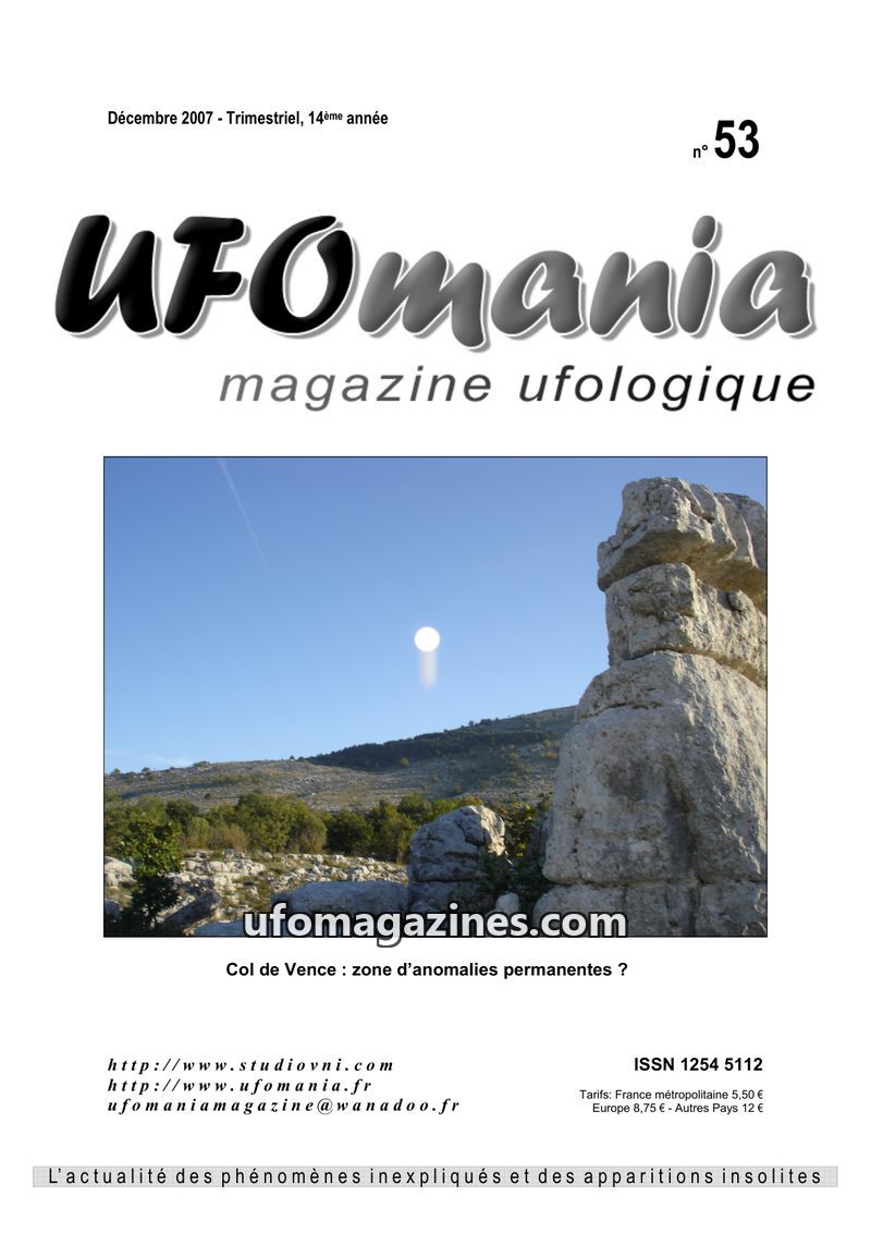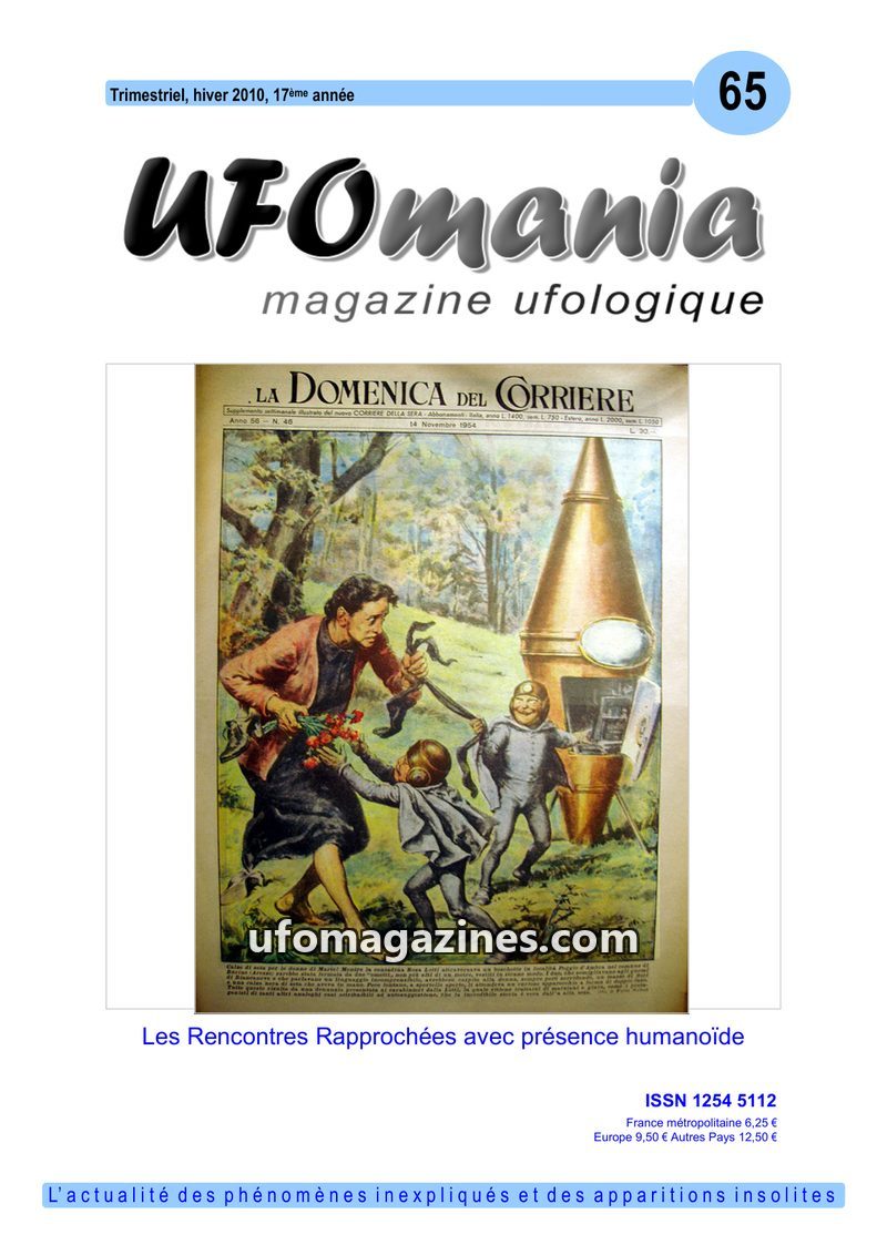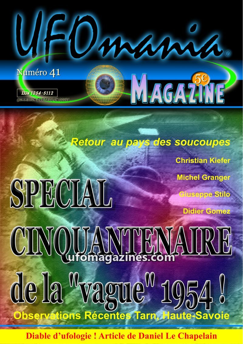 This issue of UFOmania Magazine commemorates the 50th anniversary of the 1954 'flying saucer wave' that swept across France and Italy. It details numerous sightings from the Tarn a