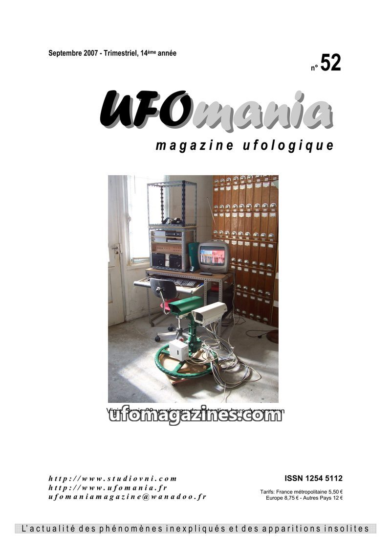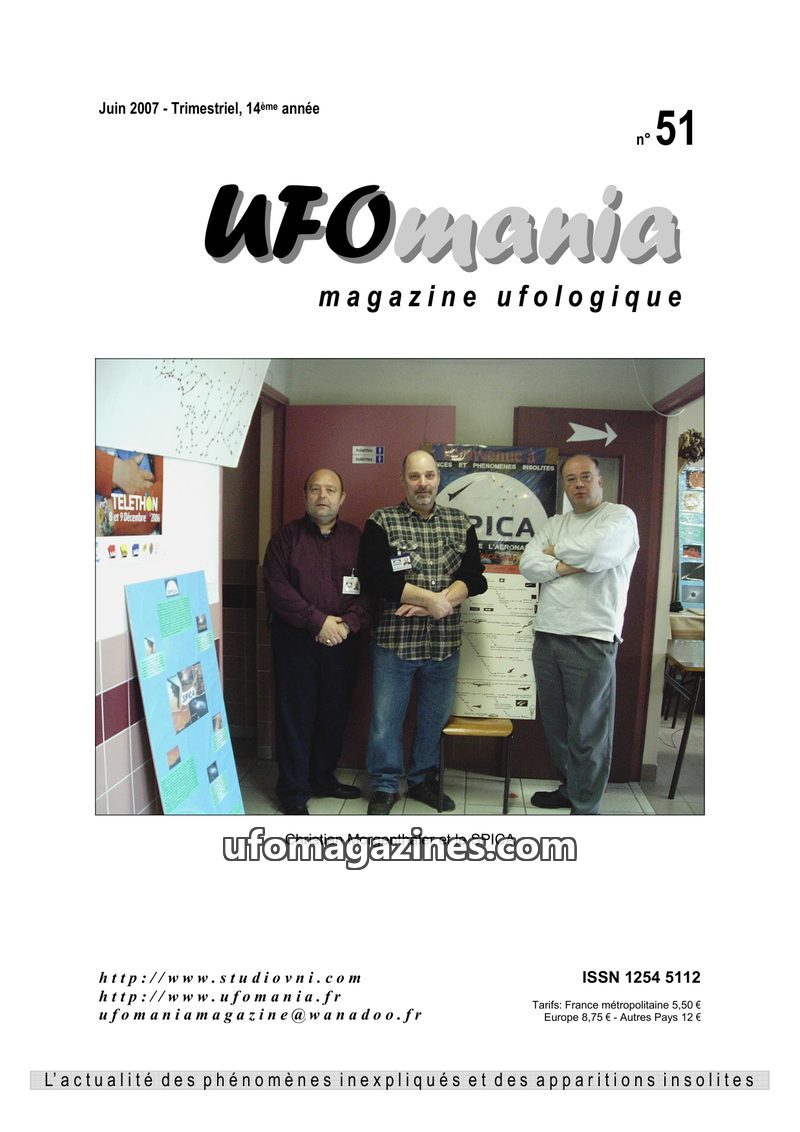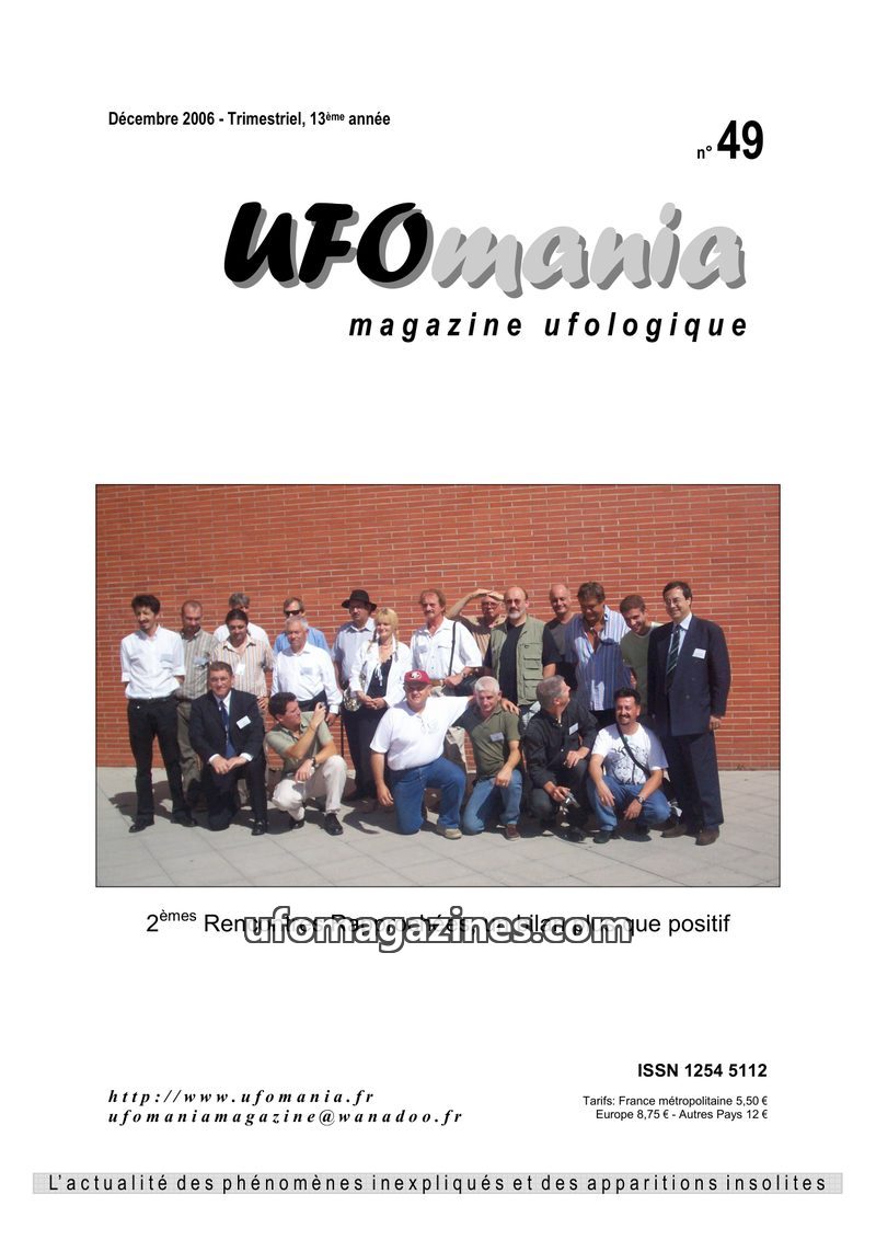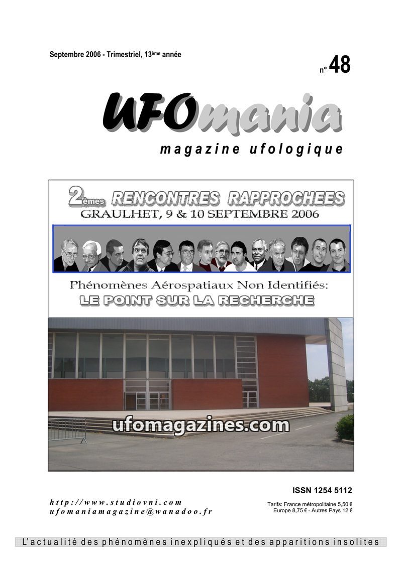 This issue of UFOmania Magazine commemorates the 50th anniversary of the 1954 'flying saucer wave' that swept across France and Italy. It details numerous sightings from the Tarn a