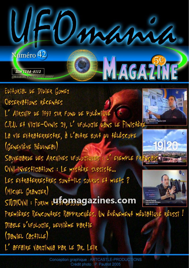 This issue of UFOmania Magazine delves into various aspects of ufology, including recent sightings in France, historical cases like the 1897 airship, and the scientific search for